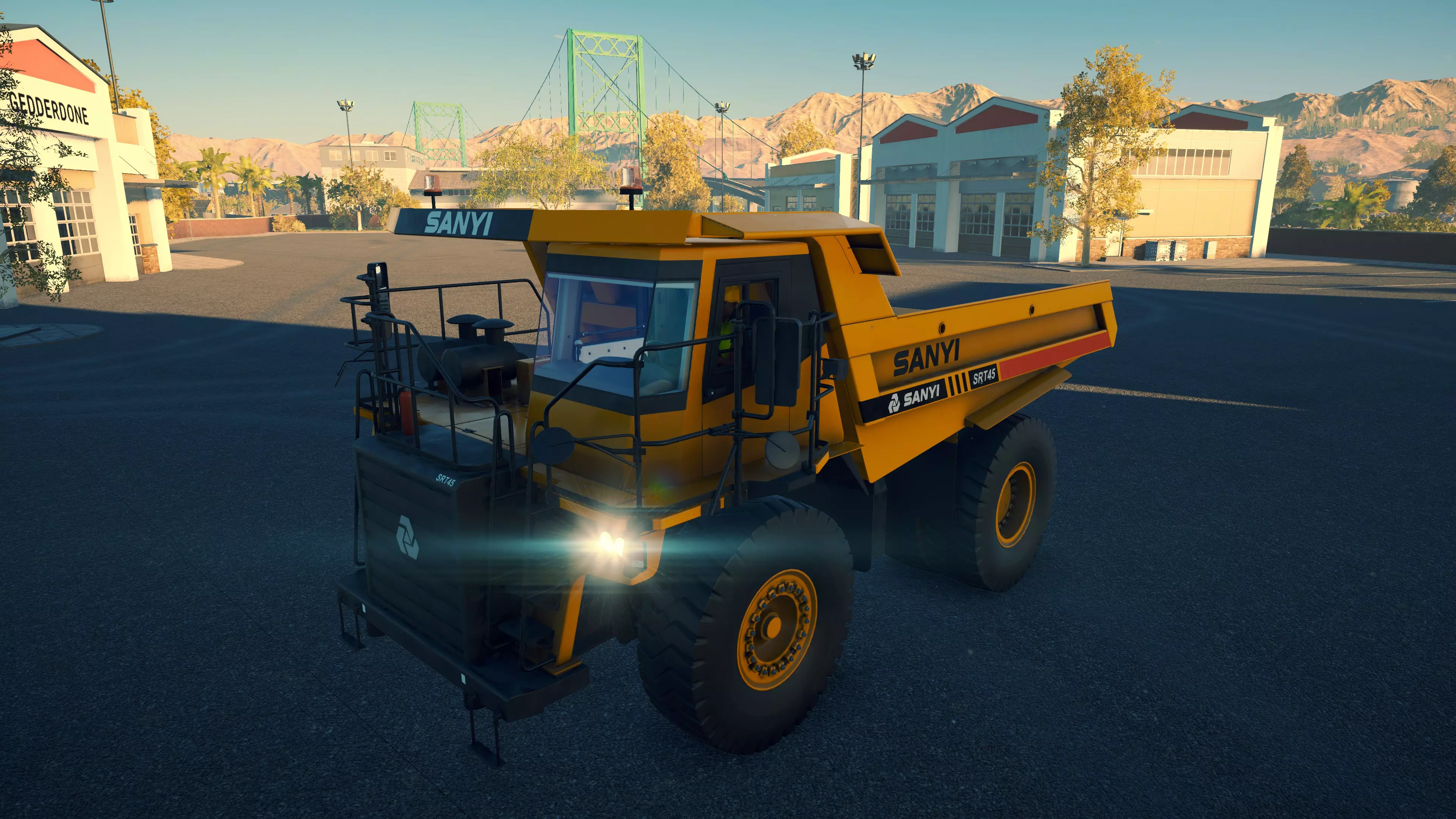 三一重工 SRT45 购买/租赁 - 196,000美元/3,920美元 长度 - 9.02米 宽度 - 5.28米 高度 - 4.6米 转弯直径 - 19米 最高速度 - 56公里/小时/8公里/小时 加速度 - 40/56公里/小时(7/16秒内) 散装物料容量 - 21.46立方米 压力测试 - 3分25秒 这辆卡车的容量仅次于Maxtreme。不过,它存在一些缺点,使其表现不佳。首先,在任何不平坦的地形上行驶时,这辆卡车很容易陷入困境。其次,它的体型大得夸张,尤其是高度和宽度,因此在许多作业现场移动会很困难。第三,它的爬坡能力很差。最后,它在行驶过程中往往会洒出大量物料。不过,由于其宽大的自卸车身,它在铺设均匀的散装物料层方面表现相当不错。一段短距离的上坡会损失一些速度,但再长一点的坡就会让你慢得像爬一样。不过这辆卡车有一点值得肯定,即使在最高速度下转弯也非常出色,而且不会失去牵引力。从这个角度来说,它开起来很轻松。 铰接式自卸卡车 这些卡车的主要用途应该是将材料从建筑工地运往 gravel plant(碎石厂)出售,而不是比如将 gravel(碎石)运回。其宽大的车斗更容易装入泥土,而且通常你可以超载不少,超过标称的容积——标称容积是指你可以通过手动或上下文菜单装载的最大散装材料量。不过更重要的是,它们的卸载速度比普通自卸卡车快得多。如果你只是将泥土倾倒到出售格栅中,这能节省不少时间,但却很难将 gravel(砾石)均匀铺开。