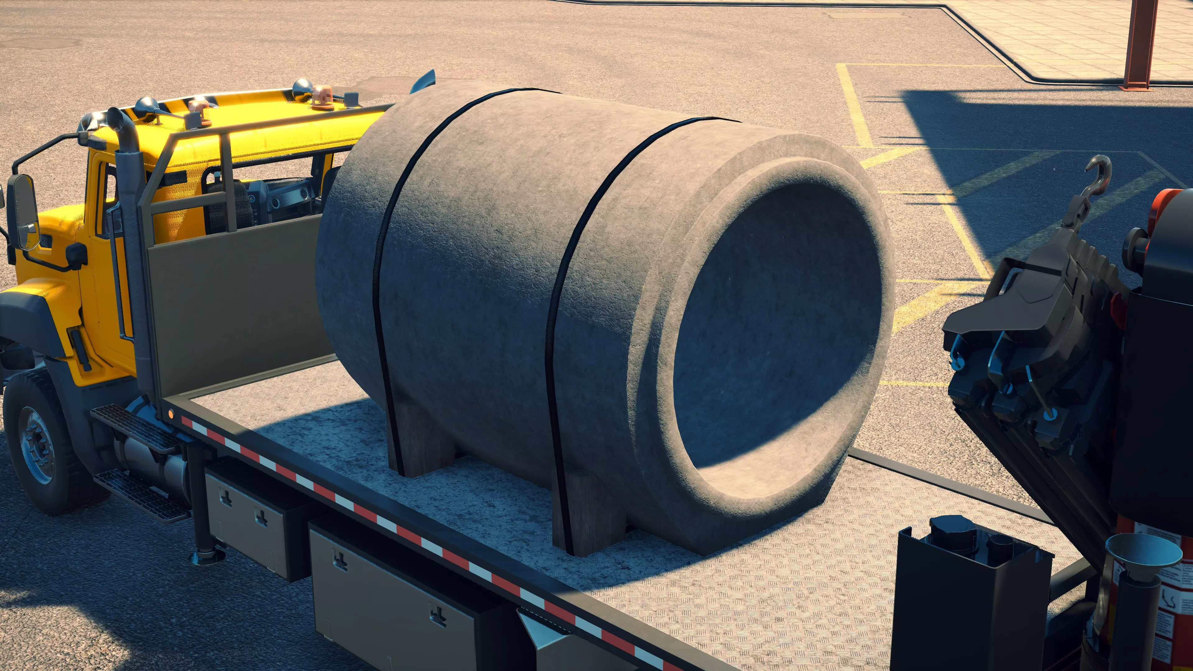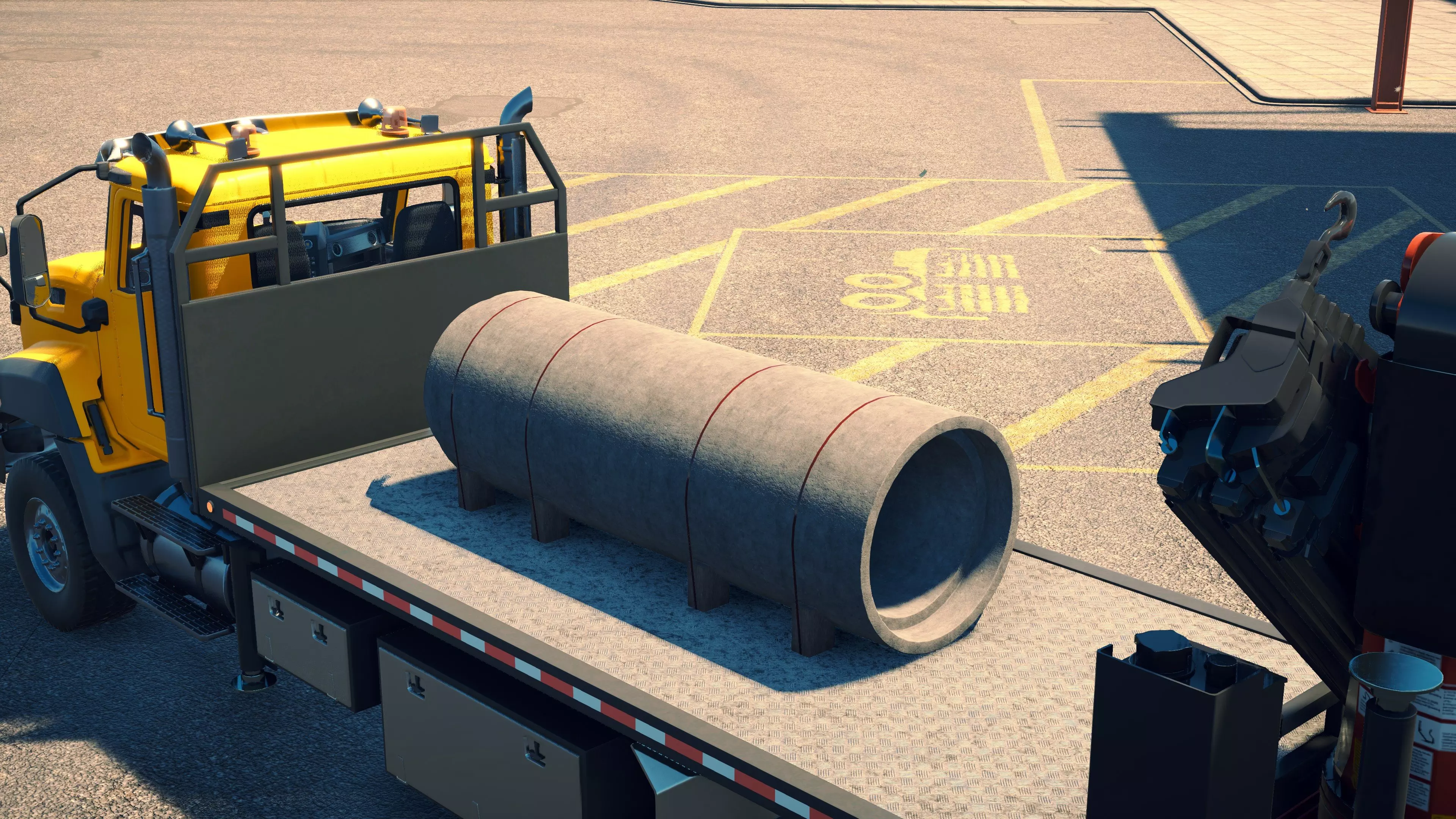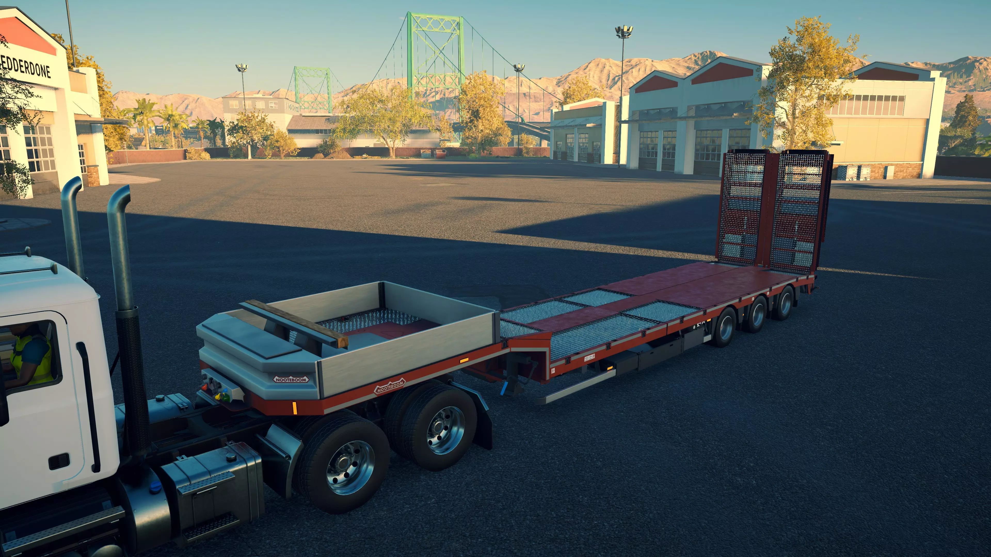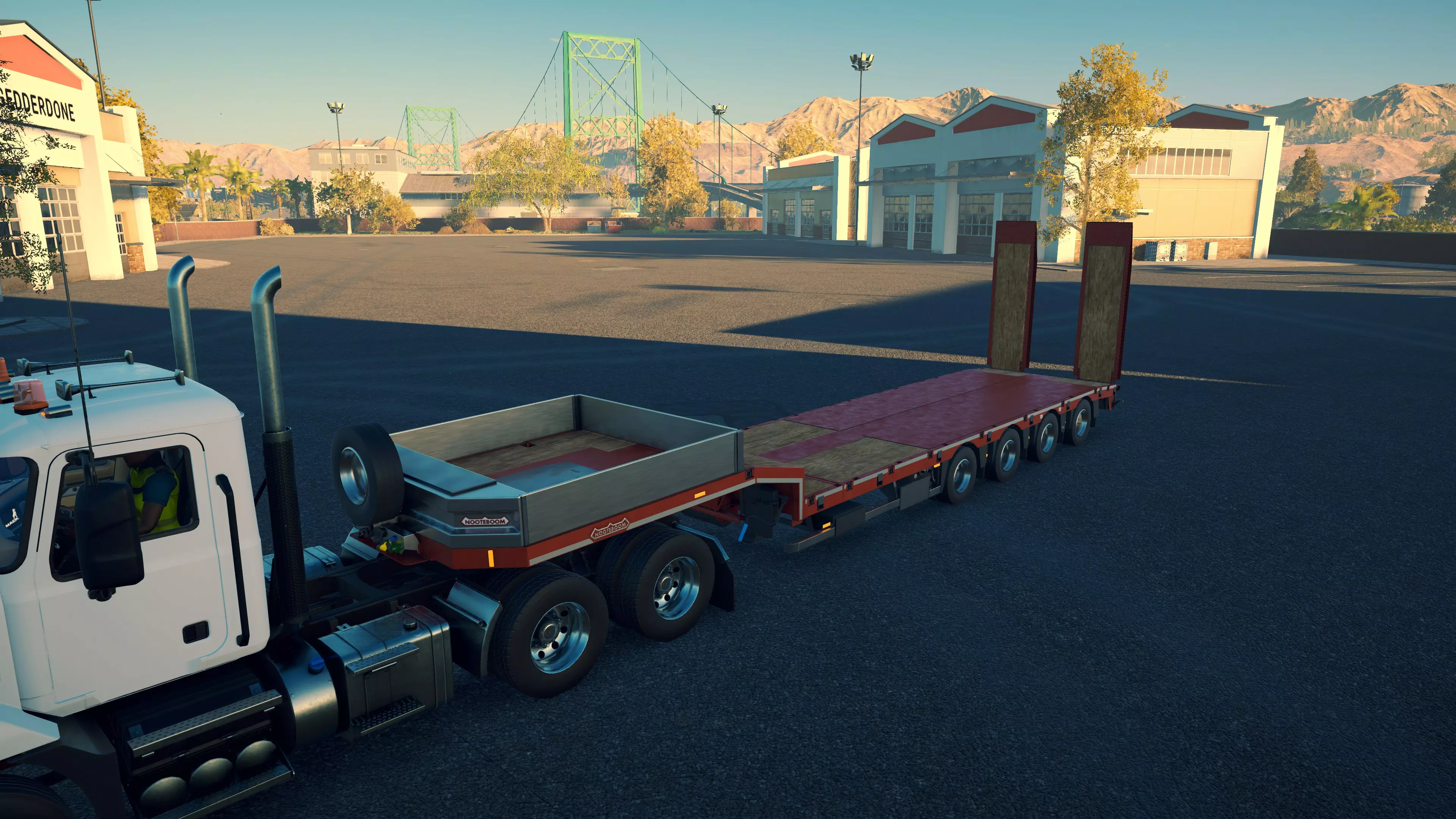 Nooteboom MCOS-58-04V 购买/租赁 - 45,000美元/900美元 长度/带坡道 - 13.48米/16.04米 宽度 - 2.9米 高度/带坡道 - 3.6米/2.32米 cargo区域(单位) - 42L/12.5W/15H(8.4米/2.5米/3米) 这是游戏中最短的拖车,与48-03型拖车实际上没有太大区别,不过较短的坡道在装载某些类型的机械时可能容错率更低。在主销上方还有一小块区域,比MCOS-48-03(EB)型上的略大,一个电缆卷筒可以轻松无固定地放置其中,但无法容纳比这更大的物品。 **此拖车无法运输以下设备**:CAT CT660平板卡车、Mack Granite服务卡车、任何混凝土泵、搅拌车或搅拌泵、任何移动式起重机、旋挖钻机、冷铣刨机或平地机。除斗山DL550-5和凯斯1021G外,它可以固定大多数装载机。然而,超过一半的挖掘机太大,无法固定在拖车上。这些型号包括卡特彼勒349F、斗山DX530LC-5、杰西博JS220X、三一SY305、阿特拉斯340 LC、三一SY500H Tier 4F以及利勃海尔R956。能够装下的自卸卡车只有曼恩TGS沥青自卸车、曼恩TGS/迈勒P330、杰西博6T-2和威克诺森DV100。它可以运输不止一台机械,但前提是它们的总长度不超过约8.5米。