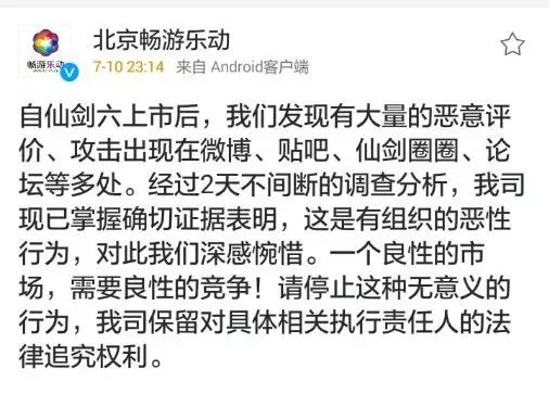 让玩家感到极度失望的是游戏发行商的态度。《仙剑奇侠传六》发售几天后,其发行商北京畅游悦动在官方微博发布公告称,怀疑针对游戏的批评是竞争对手有组织的诽谤行为。这显然十分荒谬,《仙剑奇侠传六》本身确实存在诸多问题,并非一份指责公告就能掩盖的。