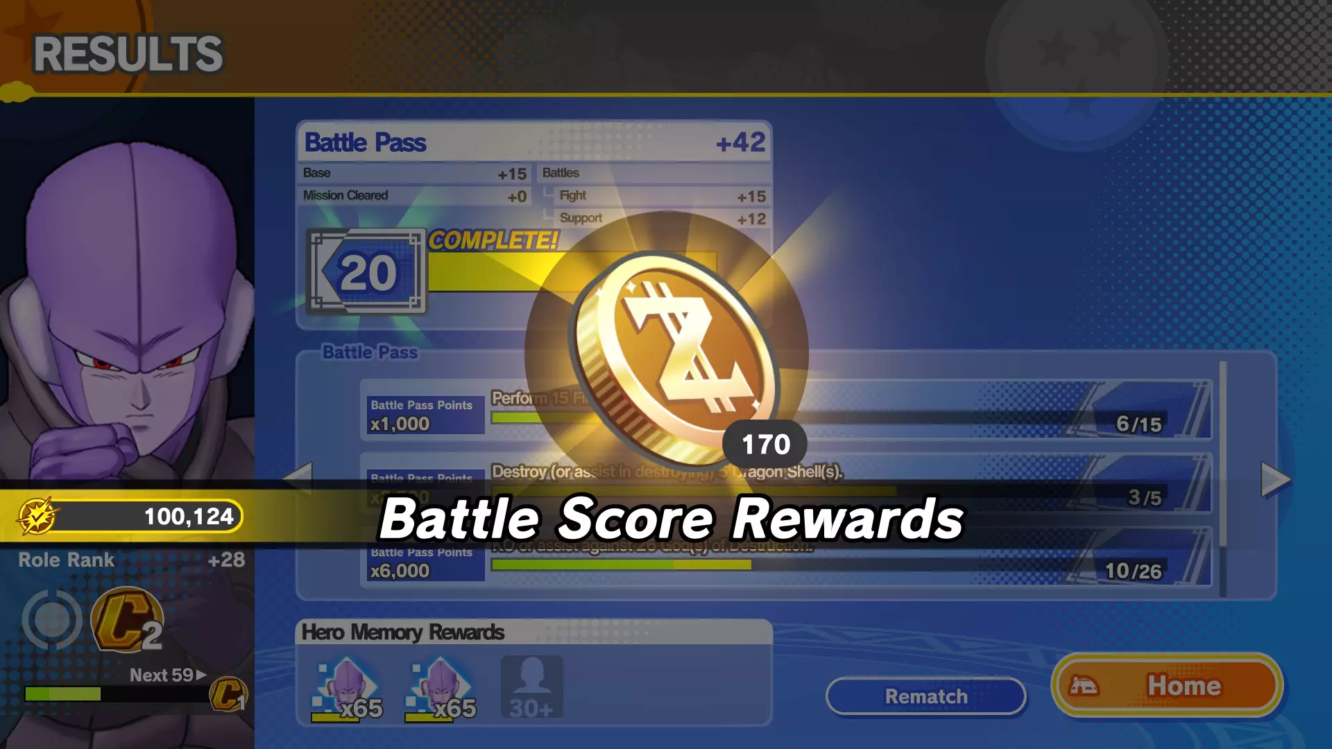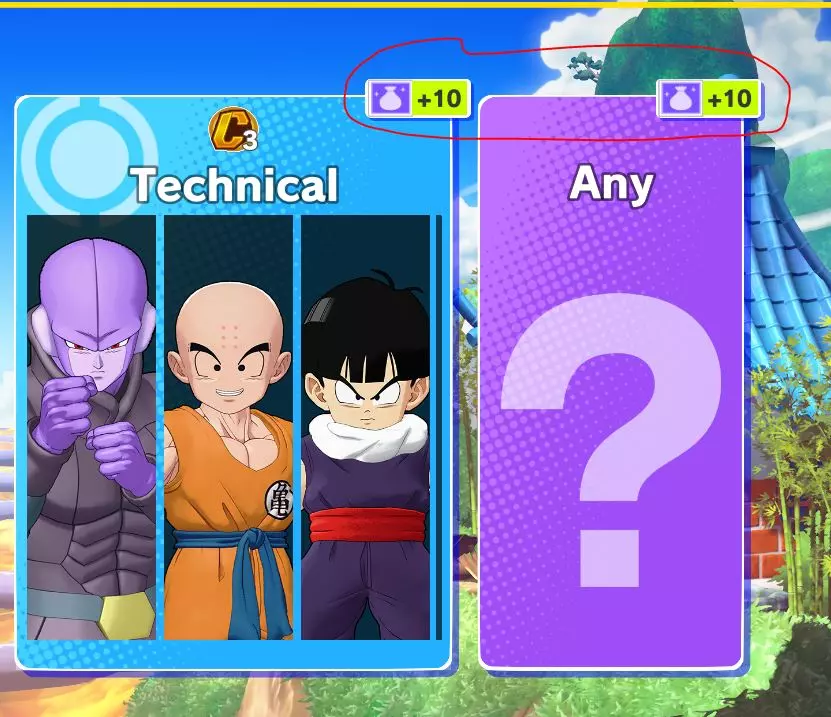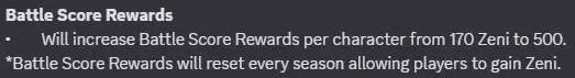 战斗评分 当你的战斗评分达到100,000时,每个角色都会获得一次性的zeni奖励。要查看某个角色是否已获得该奖励,只需在主菜单或比赛中途的角色选择界面中,查看其名字旁是否有金色对勾标记。 每个角色可获得500 Zeni(第0赛季为170 Zeni),且每个赛季金色对勾标记都会重置。