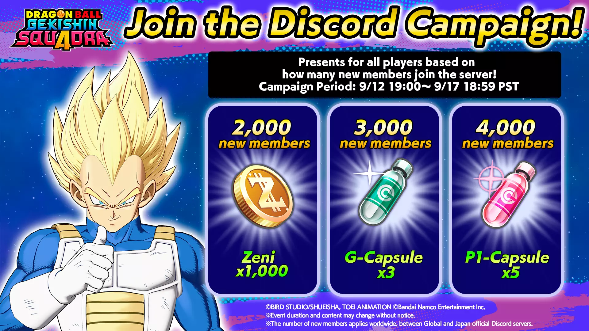 促销活动 目前,Gekishin Squadra的开发者正在积极开展促销活动。这些活动设有目标,玩家需完成以下任一任务:A:参与/加入;B:观看特定内容。活动设有如图片所示的特定里程碑目标。 遗憾的是,开发者**未在官方Steam论坛发布相关信息**。 促销活动示例 a