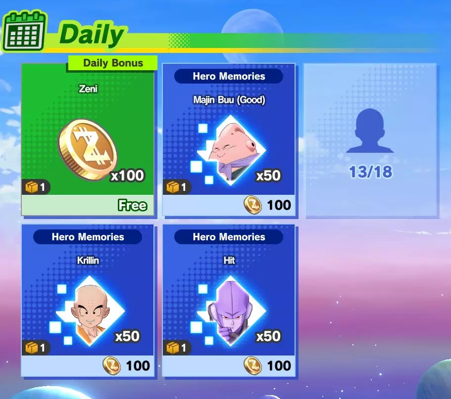 每日商店更新 每日在商店中你可以获得1个免费物品。该物品位于可购买英雄记忆的那一栏。部分日子会提供zeni(zeni),目前尚不清楚这是有固定时间安排还是随机的。