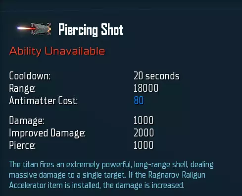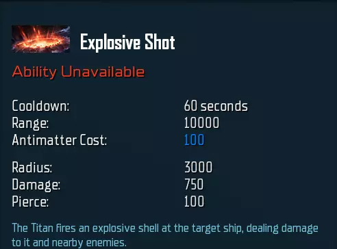 接下来是“爆炸射击”。它是你对抗成群敌人的最佳工具,能造成可观的范围伤害。它的穿透力较低,因此几乎无法对主力舰或更大的舰船造成伤害,而且40秒的冷却时间让你无法频繁使用这个技能。此外,它也无法一击摧毁小型舰船,那么为什么还要使用它呢? 有几个令人信服的理由值得考虑。首先,它能有效削弱敌方舰队的绝大多数舰船。其次,在漫长的终局战斗中,你会发现每场战斗都能多次使用这个技能,因此总伤害将会大幅提升。与“穿透射击”不同,这个技能对AM的依赖较低,省去了你原本需要进行的所有AM升级费用。最后,你的泰坦本质上就是一个单体目标杀手。即使你没能使用穿刺射击,战斗中仍可依靠拉格纳罗夫(Ragnarov)来消灭敌方高价值目标。因此,如果你的敌人更倾向于人海战术而非精英单位,就应该始终考虑使用这项能力。