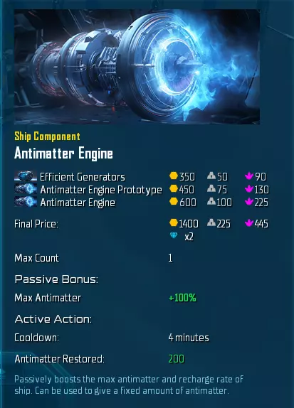 实用道具与你在主力舰上获得的并无不同。然而,尽管属性相同,其影响却大相径庭。 如果你决定学习“穿刺射击”技能,那么“反物质引擎”是必备道具。它能提升你的反物质储备量,激活时还能恢复部分反物质。这意味着“穿刺射击”技能大约能多释放9次。即使在1级时,这也能造成9000点伤害!