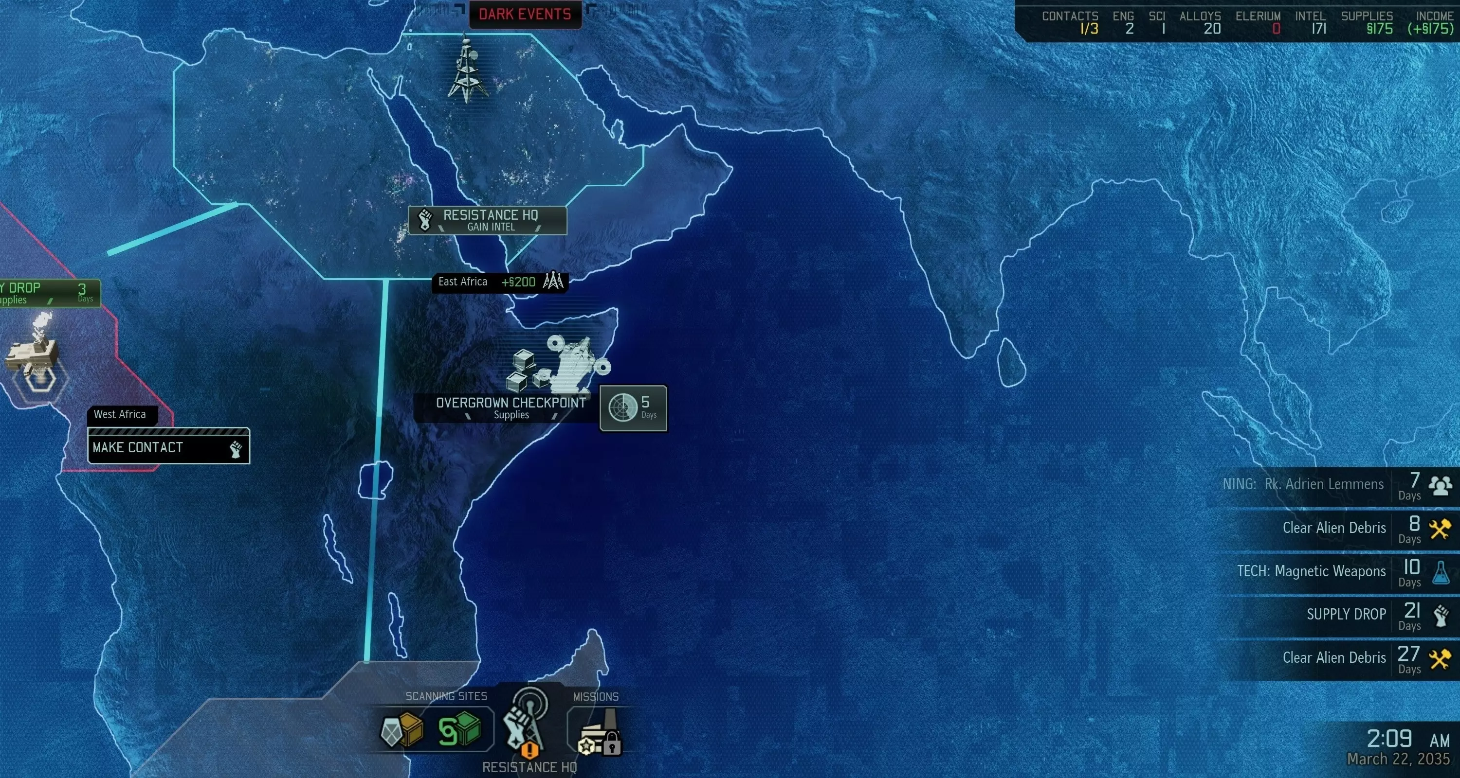 完成补给投放扫描后,应优先招募科学家,再招募工程师。 注意:在月度报告中,科学家和工程师均使用“医生”这一职称。 黑暗事件 以下是最危险的黑暗事件,建议仅让其中一个生效: 黑暗事件名称 理由 外星密文(Alien Cypher) 会使扩展联络人和黑市购物的情报价格翻倍! Advent 乡村检查站(Advent Rural Checkpoint) 会减少下一次月度补给! 任何“天选者计划突破”事件(Any Avatar Project Breakthrough) 会为“天选者计划”增加1-2个红色标记 每月的反黑暗事件任务总能消除一个黑暗事件。 注意:需要进行战略性存档,以便获得更好的随机结果,并在不浪费情报的情况下发现隐藏事件!重要提示:进度重置漏洞 必须将访问反抗军总部的行动推迟到 Advent 开始他们的反击之后。