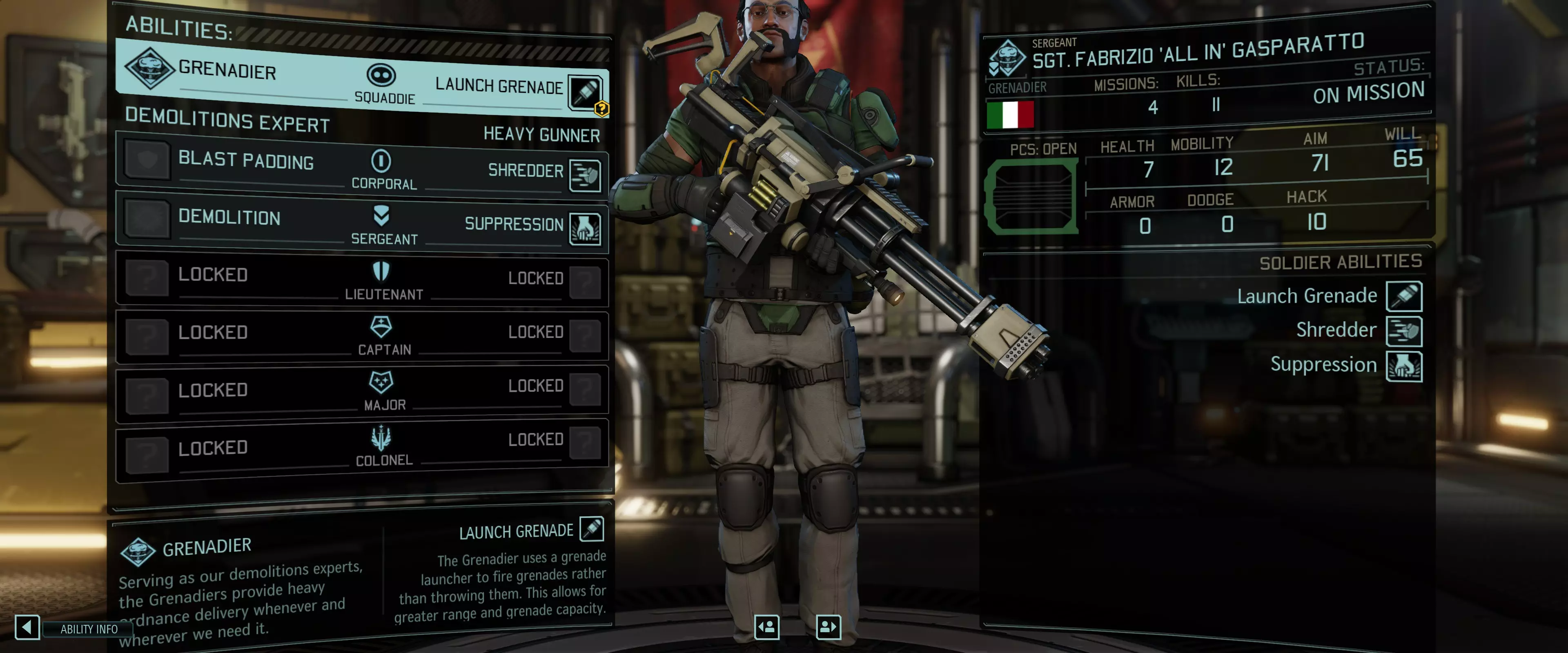 “失控协议”是控制任何机械单位(如炮塔、机械化士兵或 Sectopod)的必要条件。 注意:该职业在中后期游戏中凭借“守护者”技能将成为最高伤害输出。 士兵技能选择:掷弹兵 早期游戏中的“移动均衡器”,可稳定不断提升的敌人难度。