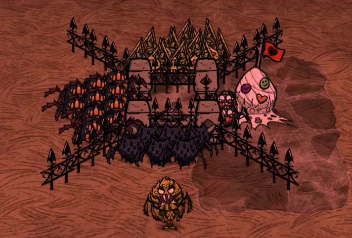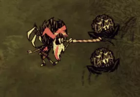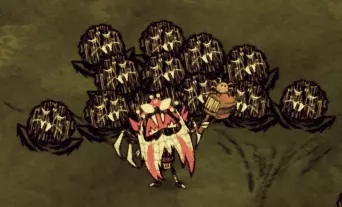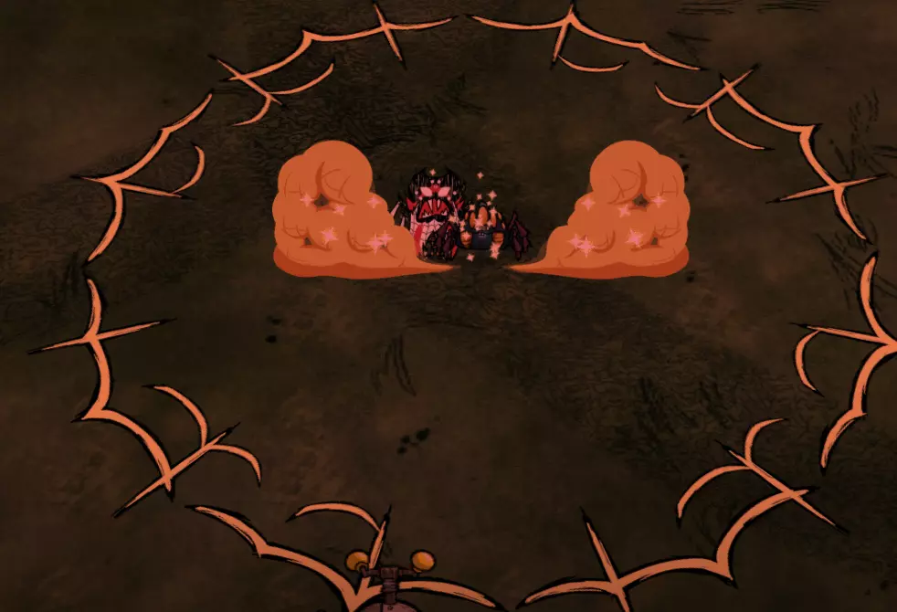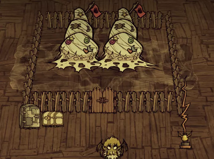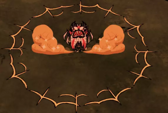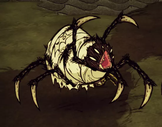 海行者本身除了对抗帝王蟹外,并不是什么出色的战力。不过,当最终要与帝王蟹决战时,你很可能已经囤积了大量这类资源,因为无花果在其他食谱中确实不常被用到。 蜘蛛女王: 在这次更新中还是不能像牛群一样利用她吗?真令人失望…… 总体而言,蜘蛛女王是个相当不起眼的小Boss。她拥有2500点生命值,每次挥击能造成80点伤害,唯一的攻击方式就是近战刺击。然而,战斗的难点在于她在战斗过程中会召唤的随从。她大约每12-20秒就会召唤一只蜘蛛随从,可能是三种蜘蛛中的一种。非战斗状态下,她主要会生成普通蜘蛛,并有小概率生成战士蜘蛛,最多可生成16只蜘蛛。但进入战斗状态后,她大约有1/5的概率生成护士蜘蛛,这才是真正有趣的开始。 击杀蜘蛛女王的理想方法是,一旦蜘蛛生成就优先消灭它们,这样可以让她尽可能地处于脆弱状态。攻击她的最佳时机是她刚生成的时候,此时她没有任何仆从支援,相当于一半的战斗已经帮你完成了。然而,如果她已经生成了满群16只蜘蛛,那么即使要交战也要格外小心,甚至最好避免此时交战。 韦伯有一种对付蜘蛛女王的方法,那就是利用她自己的部队来击败她。这需要相当数量的怪物肉,但如果你蜘蛛养殖得当的话,应该会有充足的储备。具体方法如下: 等待蜘蛛女王召唤出她所能召唤的最大数量的小蜘蛛,然后将它们全部驯服。注意,处于女王影响下的蜘蛛,其影响力机制是关闭的,因此你需要单独喂养每一只蜘蛛。之后,命令这些蜘蛛去攻击它们的女王,它们会帮你完成大部分的脏活累活。你需要重复这个流程几次,而且任何额外加入战斗的蜘蛛都很适合驯服。如果女王召唤出了护士蜘蛛,你最好立即驯服它并将其捡起,这样既能为自己解锁Switcherdoodle,也能阻止它继续治疗女王。蜘蛛女王只能从3级蜘蛛巢中生成。她需要12.5-25天的时间才会出现。一旦她出现,若附近的巢穴数量少于4个,她会在原位置留下一个1级巢穴,这个1级巢穴比其他巢穴更快成熟为2级。如果薇克巴顿正在使用所有的芦苇,这对于复制巢穴非常有用,因为你可以用一个巢穴的代价获得两个。如果你不杀死女王,也不用担心!她最终会在其他地方变成一个1级巢穴,所以你仍然可以升级它,然后拆除以收集蜘蛛卵,或者直接摧毁它。 记住,如果你不想面对蜘蛛女王,你可以用剃刀刮蜘蛛巢,使其降级1级。或者你可以装饰巢穴来阻止它生长,从而防止女王生成。
