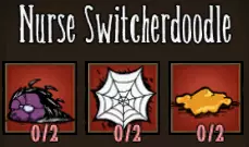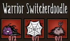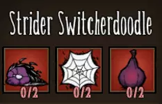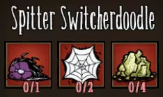 共有七种“转换零食”,除了普通蜘蛛外,每种蜘蛛类型各对应一种——毕竟谁会想用平庸来拖累自己的军队呢?在详细介绍这些特殊食物之前,先说明一些喂养蜘蛛的通用规则。 韦伯在一群未驯服的蜘蛛中喂养单只蜘蛛时,会同时驯服他直接喂食的蜘蛛以及附近距离最近的另外两只蜘蛛。策略得当的话,你只需花费1块小肉就能驯服3只战士蜘蛛,这确实非常划算。蜘蛛现在也能从肉类的治疗效果中获益,所以如果你给蜘蛛喂食肉干,它们的生命值将会得到大幅提升! 你现在还可以直接从物品栏中给蜘蛛喂食!这将驯服你物品栏中的蜘蛛,以及世界中附近的一只蜘蛛(如果有的话)。从物品栏中放出已驯服的蜘蛛后,它会像普通宠物一样跟随你。 你可以给世界中的蜘蛛和物品栏中的蜘蛛喂食“Switcherdoodles”,但这样做不会触发影响机制。只有你喂食的那一只蜘蛛会被变形并驯服,不会有其他蜘蛛受到影响。处于蜘蛛女王影响下的蜘蛛也是如此,你一次只能驯服一只。 接下来是“Switcherdoodles”的配方。一般来说,制作它总是需要通过蜘蛛养殖获得的丝绸和怪物肉。本指南不会详细介绍蜘蛛养殖相关内容,你可以在“荣誉提及”栏目中查看Canis的指南,他的讲解比我好十倍!