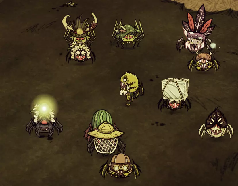 基础蜘蛛信息: 那么,无论是组建军队还是作为炮灰,我们该如何运用它们呢? 在本节中,我将介绍每种蜘蛛的类型、它们在战斗中的用途,以及一些你需要了解的基本信息。根据经验,除非另有说明,所有蜘蛛攻击时都会造成20点基础伤害。所有类型的蜘蛛都可以戴帽子!我也会推荐每种蜘蛛适合的头部装备,但要记住,某些帽子戴在蜘蛛身上时其效果会被取消,例如羽毛帽或蜘蛛帽,尽管它们的耐久度仍会消耗。 需要注意的是,用蜘蛛作战通常在资源方面成本较高,而且并非总是最佳选择。总会有其他选择,如果替代方案更便宜且更实用,那就不要犹豫,直接用它们。毕竟这是一款团队合作游戏,所以韦伯的方案不一定总是最佳方案,但如果你的其他队友没有做好战斗准备,这也不失为一个选择。而且,用一群嗜血的怪物大军来击杀像龙蝇这样的巨兽,简直太酷了!不过要记住,如果你不懂得巧妙使用口哨,蜘蛛们会吃掉首领的掉落物,比如巨鹿眼球或远古守护者之角。 如果你正在为战斗做准备,首先要了解你的目标。如果它们有像巨鹿那样的范围攻击,那么可以考虑带上更耐打的蜘蛛,并给你的治疗蜘蛛戴上头盔。如果你的目标只是一个发条主教,那么像喷射蜘蛛这类能够拉近距离或弥补射程的蜘蛛会是更好的选择。每种蜘蛛都有其优缺点,所以要考虑好带哪些蜘蛛! 蜘蛛们尤其擅长无情击杀的一个著名 Boss 是帝王蟹。作为《饥荒:联机版》中常被认为最棘手的 Boss,海蜘蛛却能让它变得异常简单。只需让你的海蜘蛛开始攻击,同时绕着它航行以躲避其召唤的间歇泉。只要海蜘蛛数量足够,它们的输出就能超过帝王蟹那夸张的治疗量……不过要注意,如果它试图冻结你的水生伙伴,记得用冰杖攻击它几下。不过,有少数几个 Boss 仅凭蜘蛛几乎不可能击杀,除非你非常非常执着,并且拥有大量的资源和可牺牲的单位: - **熊獾(Bearger)**:无论你有多少治疗单位和头盔,它的范围攻击都太强了。最终它会凭借纯粹的力量击溃你的部队。 - **克劳斯(Klaus)**:它的元素攻击太多,蜘蛛难以应对,而且众所周知,先杀死鹿是个非常糟糕的主意。 如果你非要用蜘蛛(顺便说一句,不推荐)去挑战暗影棋子以获取中庭钥匙,建议按以下顺序击杀: ** rook(车)→ bishop(象)→ knight(马)** 2 级车的尖叫会让你的蜘蛛在战斗中很长一段时间内失去作用,3 级象也是如此。虽然有点多余,但你也可以将蜘蛛打包带走!如果你想让一群护士蜘蛛随时随地跟着你,那么打包4只或许是个不错的主意。 韦伯和他的伙伴们正在为今晚的蜘蛛之舞做准备。