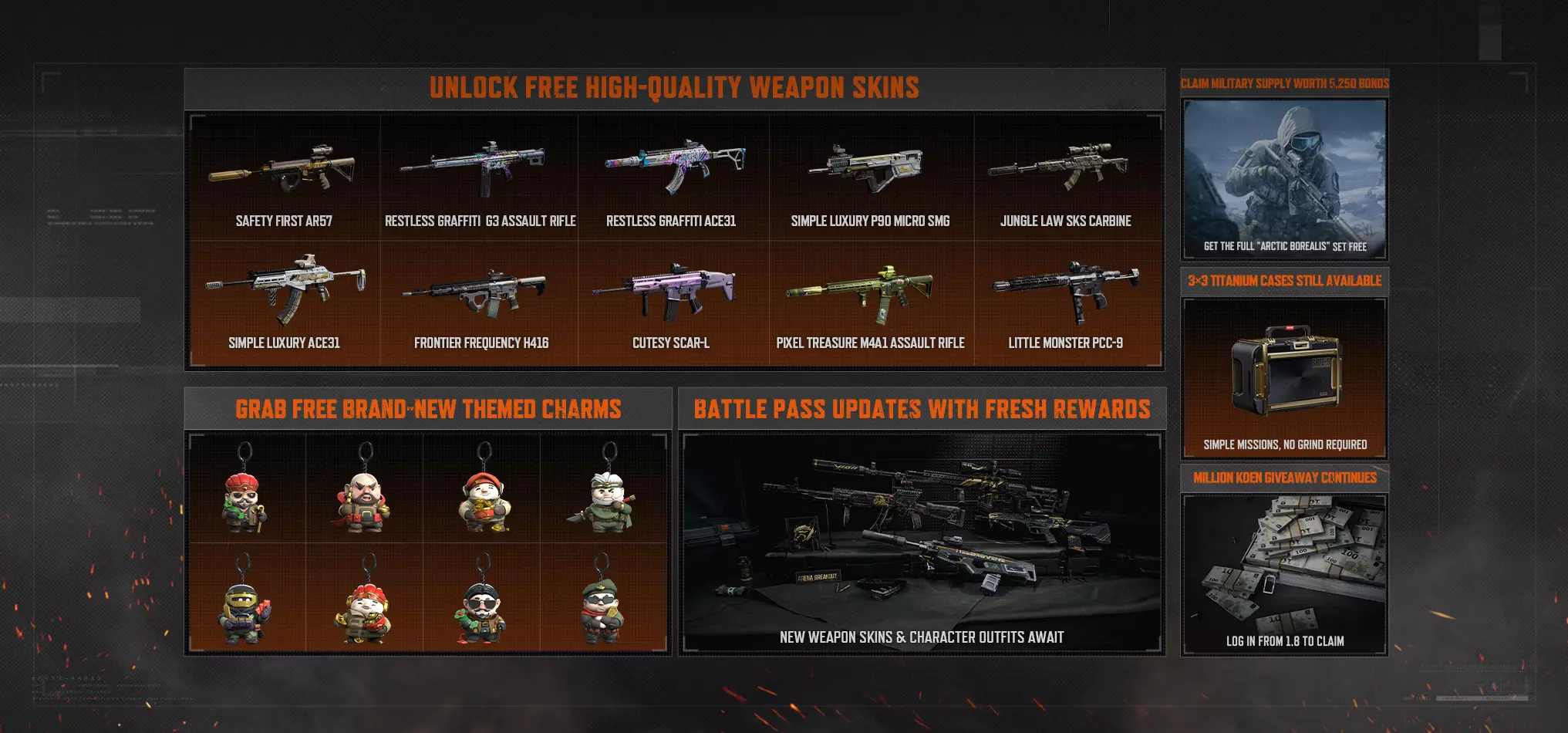 Thank you for supporting Arena Breakout: Infinite! The specifics of the Season 4: Dusk to Dawn update are detailed below: Matchmaking Unavailable Jan. 08, 2026, 01:00 (UTC+0) When matchmaking stops, you can continue playing your current raid, but you will be unable to match for a new one. Servers Unavailable Jan. 08, 2026, 02:00 (UTC+0) We plan to close the servers for 7 hours. When the servers close, you will be ejected from the game and unable to play. Planned Server Reopening Time Jan. 08, 2026, 09:00 (UTC+0) The reopening time may change, so please keep an eye on our official announcements. Update Rewards: Advanced Quick Kit x1 Koen x150,000 **For more update rewards, please go to [Event—Season 4: Dusk to Dawn] in the game to claim them.** Update Size: 30 GB How to Update: Click the Update button in the game's launcher. Updated Content: Key Updates and Optimizations1. New Map: Airport The Guoyapos International Airport, located in southern Guoyapos, is a modern aviation hub. Initially, the airport mainly served tourists from abroad. As the war progressed, it was used by both sides as a provisional frontline command center and was militarized accordingly. Map Introduction: a) The Airport map includes areas such as the Freight Center, Exhibition, Fuel Storage, Parking Lot, Ticket Hall, and Control Tower. The varied terrain across these areas will require diverse tactical decisions and offer a more dynamic combat experience. b) In the Lockdown Zone, the Airport map will contain 7 electronic safes, 7 encrypted safes, 1 regular safe, 2 Strong Boxes, and 13 small safes. In the Forbidden Zone, the number of encrypted safes and Strong Boxes will be even greater. c) Many new map mechanics have been added to the Airport, including collecting model airplanes to activate a lucky slot machine (which guarantees a gold miscellaneous item), password decryption to access hidden areas, and using specific methods to access new routes. We hope this new content will enrich your experience in raids. d) In addition to the conventional extraction points, the Airport will feature new Collaboration and Special Mission Extraction Points. You can choose the most optimal route to extract safely based on your objectives. e) The variety of lootable containers has been expanded to include car trunks, trash cans, biscuit tins, and small safes. Additionally, lootable items can now be found on building walls, which we hope will make looting more enjoyable. In addition to the new map, we've also added several encrypted safes and small safes to all other maps for you to discover. 2. New Mode: Encrypted File We've added the Encrypted File mode to the main modes for increased fun and unpredictability in raids. Encrypted Files will have a chance to appear on all main mode maps, with a higher chance of appearing in Lockdown and Forbidden Zone modes. Event Rules: a) If the Encrypted File has spawned, you will receive a notification upon entering the raid, and the raid's unique Encrypted File can be found in the container indicated on the map. b) Looting the Encrypted File will intermittently reveal your position to all players on the map. c) If the Encrypted File has not been found within 10 minutes of the raid, its location will be revealed on the map. d) Once an Encrypted File is brought out, the player and their teammates will all receive an Encrypted File in their mail, which can be used at the Intel Broker section of the Store to draw coins and Vinson Diamonds. 3. New Weather: Snowy Northridge Kamona Weather Bureau Advisory: Northridge is about to experience its heaviest snowfall in years. It's expected to be the worst storm this winter, so stay warm out there! Not only will the snow cover Northridge in a unique wintery landscape, it brings new challenges for operations in the area. As the blanket of snow thickens on the ground, you'll start leaving more tracks behind. In addition, the low temperatures have frozen the lake's surface, making it possible to cross and explore new areas on its surface. However, the extraction points near the water will be affected. Perhaps this time, you'll have to make your escape across the ice. 4. New Mode: Northridge Hotel: Melee-Only Combat We are introducing a new melee-only combat mode so you can freely experience the diverse melee weapons available in the Dark Zone and enjoy some pure melee combat. Now, victory is just a few steps away! Enjoy a new and exciting experience with melee-only combat! Event Rules: a) Loot and extract via extraction points in free-for-all raids, where only attacking with melee weapons is permitted. b) No equipment is required to join this mode, and the usage of Cases and keys in your keychains is prohibited. All players will use identical equipment provided by the system and can loot items such as throwables and Universal Keys during raids. c) The Melee Mode will disable the Case, but after defeating a player, permission can be unlocked to use the Supplies Retrieval Device on the map. **Please keep an eye on future announcements for more details on the availability of the Melee-Only Combat mode. 5. New Mode: Gold Bounty Assault-TV Station This is an arena for the strong. Valuable containers including secret air drops, encrypted safes, and small safes will appear throughout the map (secret air drops will at least contain one Gold Bounty collectible), which will greatly increase the availability of valuable loot. Eliminate all your enemies to become the final winner and take it all! **Please keep an eye on future announcements for more details on the availability of the Gold Bounty Assault mode. 6. Trophy Room Update The Trophy Room is getting another update! It now goes beyond helping with your progression, and it serves as a chronicle of your glory and memories in Kamona! Main Updates: New Trophy Room Facilities a) New Collection Room: Players who have unlocked the Trophy Room will automatically unlock the Collection Room for free after the Season 4 upda