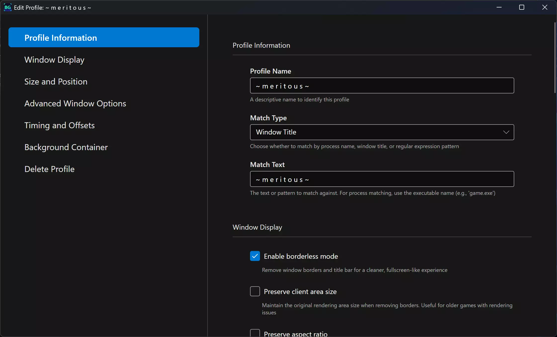 全新个人资料编辑器 告别拥挤、嵌套的展开面板!我打造了一个全新的专用个人资料编辑器,拥有美观的设置布局。 【组织化的板块】- 设置按逻辑类别分组,并配有侧边栏导航 【更优的视觉层次】- 每个设置都有清晰的标题、描述和帮助文本 【全屏体验】- 编辑器可扩展至窗口大小的80%,提供舒适的编辑环境 【实时预览】- 在大型预览面板中查看背景容器图像 【全面的选项】- 所有个人资料设置集中在一个美观、有序的界面中 个人资料编辑器板块: - 个人资料信息 - 窗口显示设置 - 尺寸与位置 - 高级窗口选项 - 时间与偏移量 - 背景容器 - 危险区域(删除个人资料)