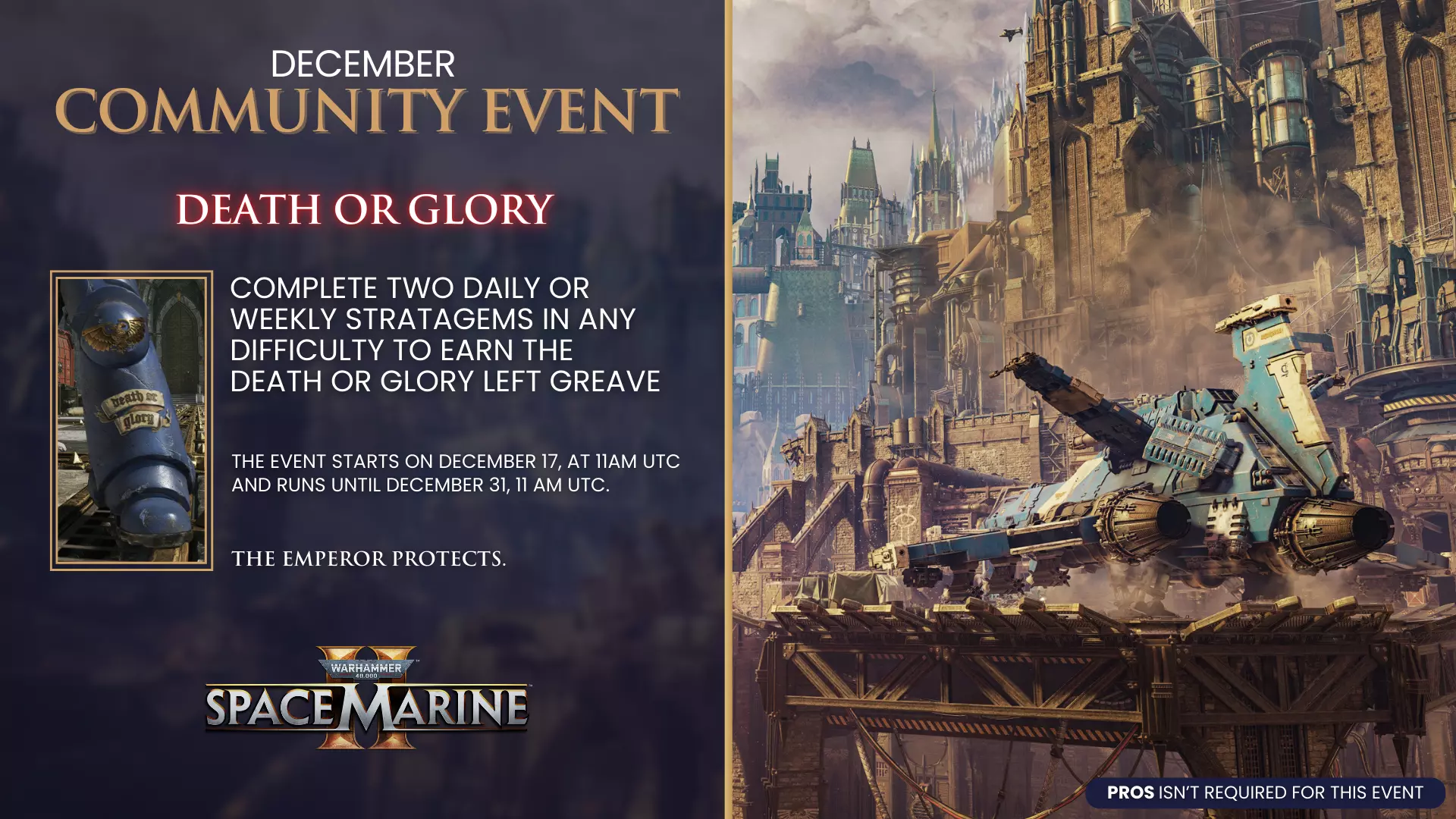 准备好,星际战士们! 为迎接年末,启动战略模式并在任意难度下完成2个每周或每日战略任务,即可获得【死战到底】左腿胫甲! 活动将于12月17日开始,持续至12月31日!