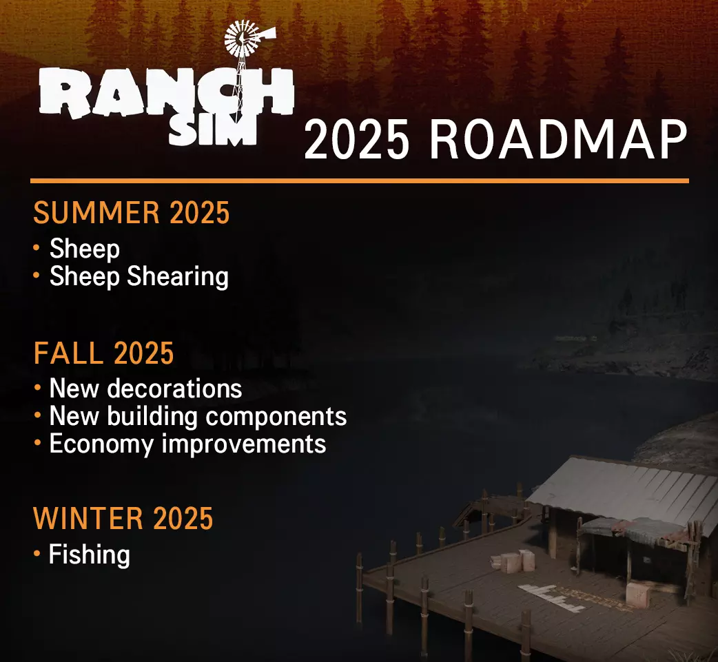 夏季,《牧场模拟器》将迎来绵羊。这些备受期待的动物可以剪取羊毛,也可以屠宰获取肉类。和游戏中的所有牲畜一样,你也可以对它们进行繁殖。 今年秋季晚些时候,我们将添加大量额外的装饰和建筑物品,让玩家能把自己的牧场打造得更像一个家。 我们还将更新游戏内经济系统,特别是围绕商品销售方面。新增基于供需关系改变价格的系统,使游戏内经济更具吸引力。 对于那些在牧场辛勤工作一天后需要放松的玩家,我们将在冬季为《牧场模拟器》加入钓鱼功能。拿起你的鱼竿前往湖边,和朋友们一起放松身心,一边享受日落一边钓几条鱼吧。 随着每次更新的临近,我们将分享更多细节和日期。 请留意最新消息,一如既往,欢迎在Steam论坛和Discord上提供反馈。