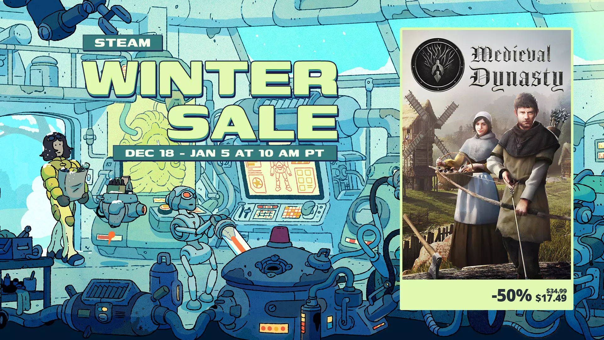 Steam冬季特卖! 在我们迄今为止规模最大的特卖活动中,为自己准备一份礼物吧。此次特卖已为假期延长! 《中世纪王朝》在Steam冬季特卖中享50%折扣。 您可以购买DLC来完善您的收藏,或选择我们的特别捆绑包,享受40%的折扣。 Steam冬季特卖将持续至1月5日。 此致 Render Cube和Toplitz团队