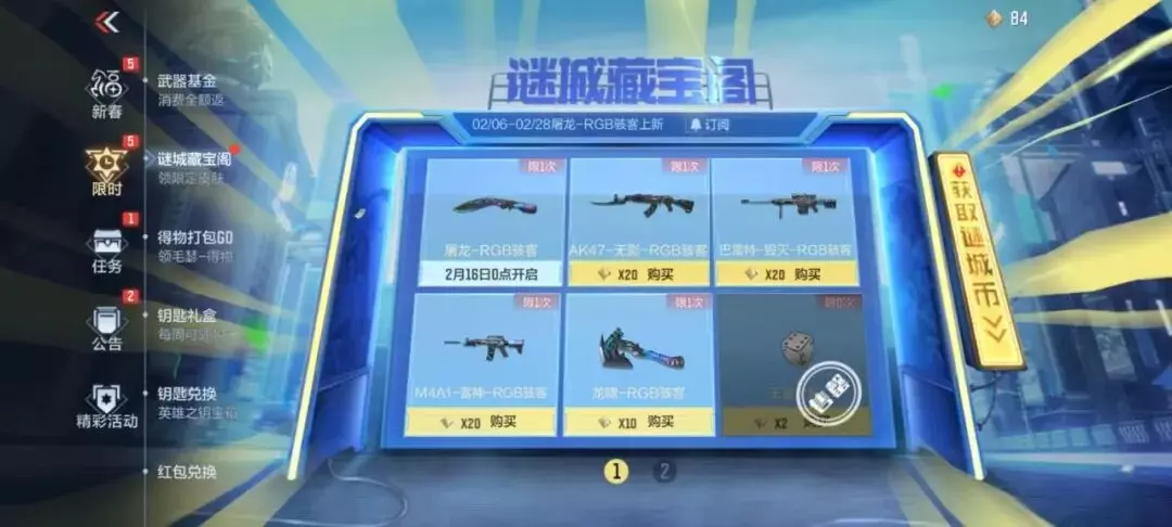 谜城藏宝阁活动首发屠龙-RGB骇客,即将于2月16日开放兑换,各位CFer记得留意!屠龙-RGB骇客极具科技色彩的外观一定可以让你喜欢~