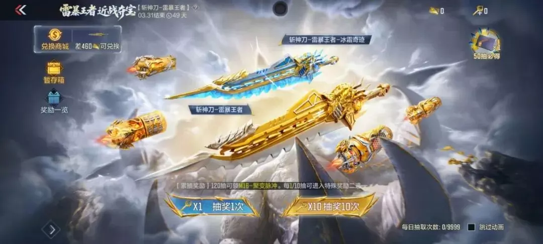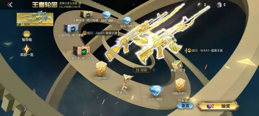 强强联合,本期王者轮回首发带来了M4A1-雷暴王者和AK47-雷暴王者,返场了M4A1-雷霆王者、AK47-雷霆王者、王者之势、王者之翼等经典王者武器。而且王者轮回奖池升级,挑战卡宝箱升级为典藏之骰,更具实用性;奖池中的赏金令积分与钻石等道具自然也非常不错~