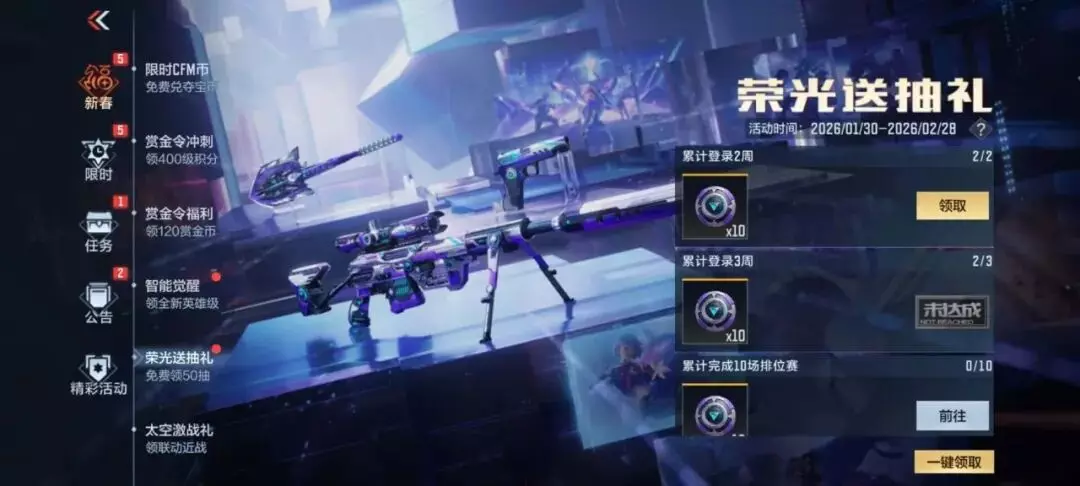完成指定任务就能领取300枚春节限时CFM币!王者轮回、王者近战、熔岩、一跃沧溟、神兵匣等活动的抽奖代币都可以免费兑换,还有S1赏金令积分哦~没想好兑换什么?不急,但一定要在2026年3月1日0点之前使用掉这些限时CFM币哦。