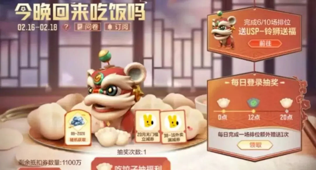 年味渐浓,新春“年夜饭”已备好!登录就能参与抽奖,钻石、美团券等你拿!完成10局排位赛还可获得限定武器USP-铃狮送福哦~