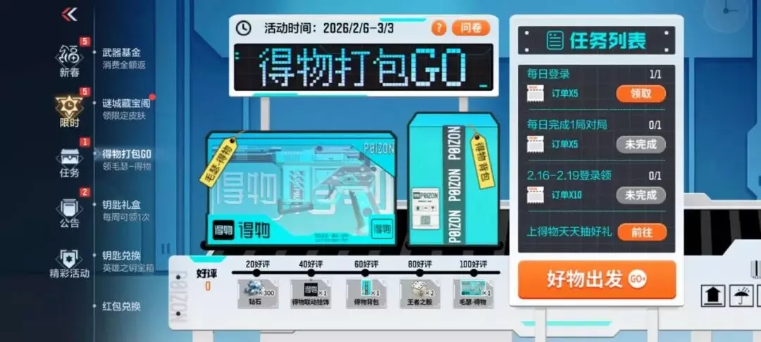 叮!您有新的订单请及时处理~得物联动活动得物打包GO开启,完成简单的一些任务即可获得很多订单,按要求“发出好物”即可获得好评,达成一定好评数量之后可领取得物联动挂饰、得物背包、毛瑟-得物等联动武器/道具~