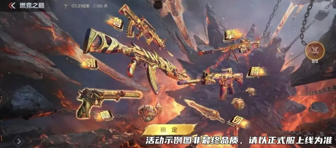 本期的熔岩夺宝首发了王者之腾、翎、掣、隐、仞、兽等武器的燃竞之巅皮肤,以及配套的其它万化!燃竞之巅系列皮肤质感出众,在高贵的金色枪身上裹上了炽热的熔岩,手持装备该皮肤的武器时,仿佛掌控了巨大的能量!