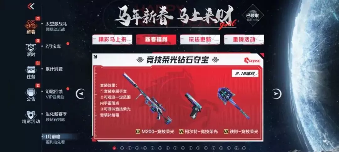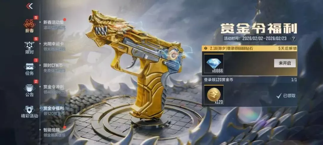 2月16日(除夕)登录即可领取6666钻石,一定一定要记得时间,千万不要错过!120赏金币在活动期间就可以领取,还没领取的CFer记得上线看看,精彩尽在赏金令福利活动中。