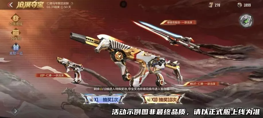 一跃沧溟夺宝活动首发马年主题一跃沧溟系列皮肤!以及仁德投掷物四件套!同时还会返场AK47-常胜、巴雷特-定军以及相应的黑化皮肤和其它万化。一跃沧溟系列皮肤设计巧妙,机械骏马身披金白相间的战甲,整体造型流畅且充满动感。仁德投掷物的死亡掉落且队友可拾取,战术意义巨大。