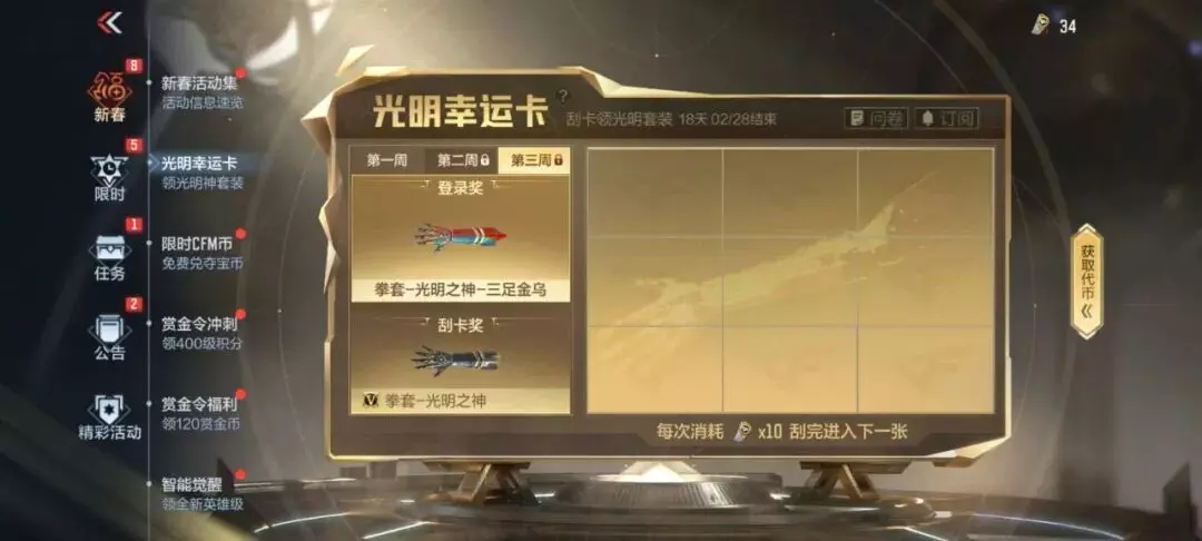 光明幸运卡活动火热进行中,即将在2月13日开放“第三周”幸运卡,登录即送拳套-光明之神-三足金乌,刮完第三周全部奖池即可领取拳套-光明之神!届时各位CFer就能集齐光明神套装咯~