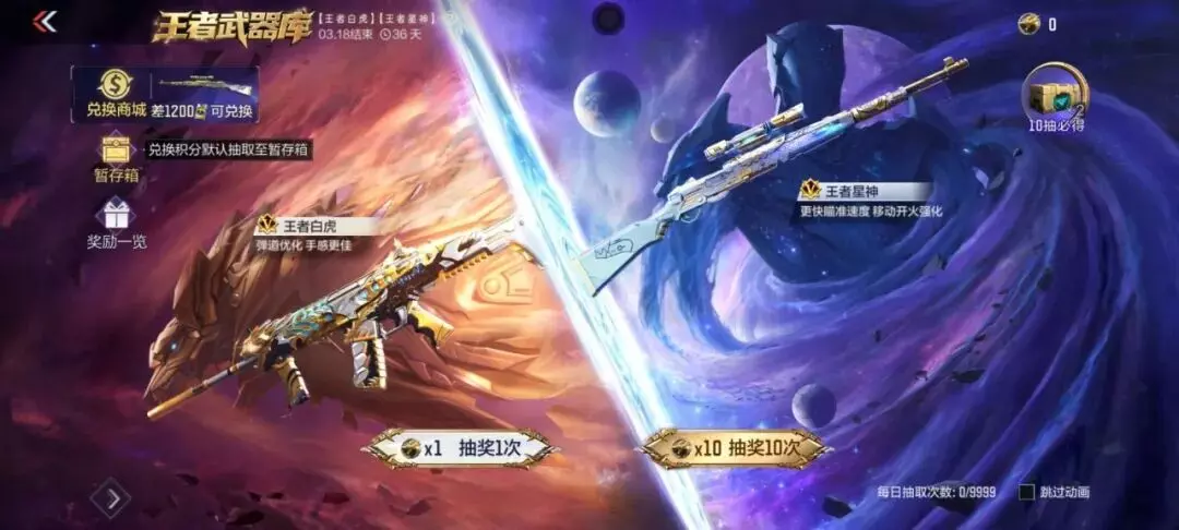 两大重磅王者武器王者白虎、王者星神以及它们的冰霜奇迹皮肤首发登场本期王者武器库,QBZ03-王者蔷薇和游骑兵系列武器返场。王者武器库活动火热进行中,你会选择这些强力王者武器吗?