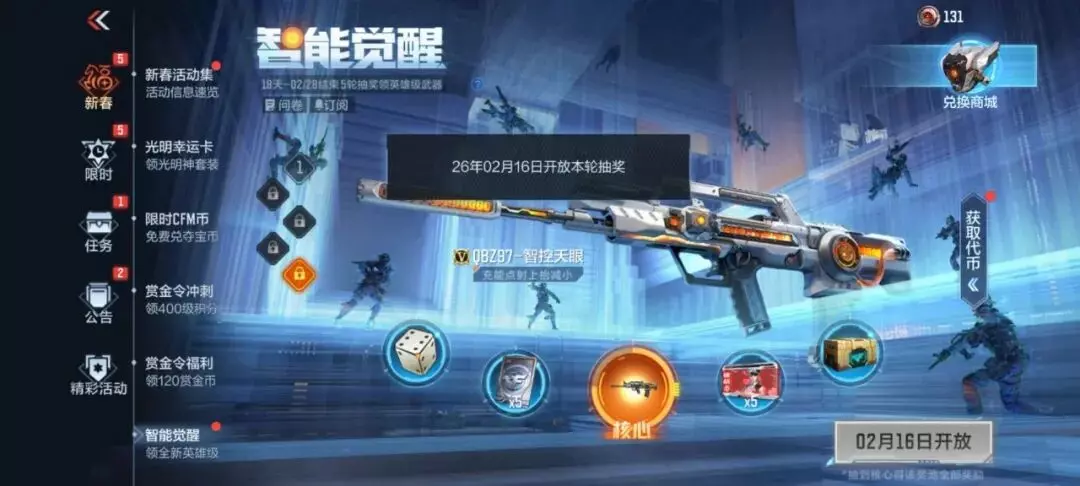 智能觉醒活动火热进行中,相信大家已经攒了很多智能币了!第五轮奖池即将在2月16日开放,届时大家就可以获得QBZ97-智控天眼这款充满赛博美学与未来科技的突击步枪了~对咯,这款武器在近期的热更新中还优化了中远距离伤害,输出能力更强!
