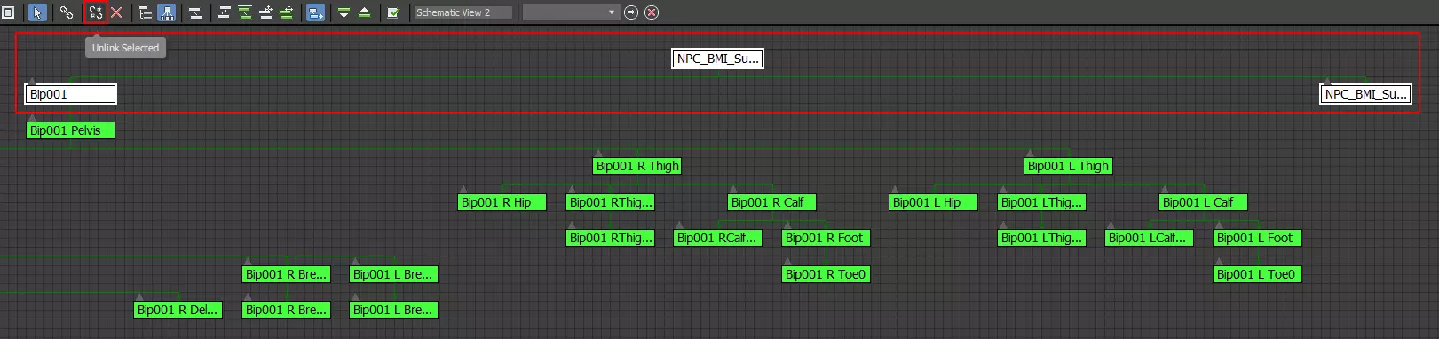 取消链接后,请确保“Bip001”是根骨骼。(如果“Bip001”不是根骨骼,再次尝试导入文件时将发生错误。)