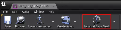 烹饪角色模型的Uasset文件 返回虚幻引擎中的BMI_MOD项目并打开内容浏览器。 双击希拉模型,在弹出的窗口中选择“重新导入基础网格体”。 选择新导出的“NPC_BMI_SuYA_Skin00.FBX”文件。