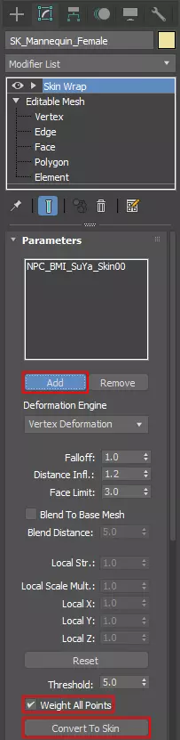 如图所示,点击添加按钮并选择希拉模型以开始皮肤包裹流程。等待流程完成后,列表中会新增“NPC_SuYa_Skin00”。勾选底部的【全部点加权】选项,然后点击【转换为皮肤】。