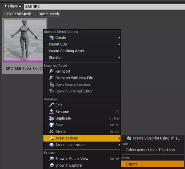 粉色标记的物体为骨骼网格物体。它们必须先导出到3DCG软件中,然后重新导入到项目里。 【NPC_BMI_SuYa_Skin00】是希拉的第三人称模型。 【BMI_SuYa_Foot00】是希拉的第一人称腿部模型。 【BMI_SuYa_Hand00】是希拉的第一人称手臂模型。 更换角色(导出原创模型) 以下演示将以【NPC_BMI_SuYa_Skin00】为例进行操作。 在内容浏览器中,右键点击模型,从出现的菜单中选择资源操作>导出。