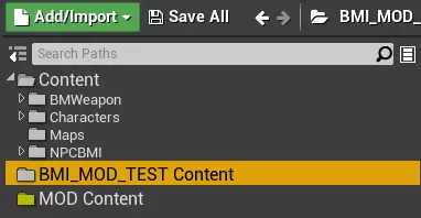 欢迎使用《光明记忆:无限》模组开发手册!本指南将介绍如何创建角色与武器模型并制作专属模组。 模组制作准备工作 1. 从Epic Games Launcher下载Unreal Engine 4.26.2。(请确保下载正确版本的虚幻引擎。) 2. 下载【BMI_ModDevelopmentKit_V1.0】并解压至电脑任意位置。 3. 下载支持蒙皮绑定的3DCG软件,例如3DS MAX、MAYA或Blender。 模组开发工具包目录结构 1. 在Unreal Engine 4.26.2中打开解压后【BMI_MOD】文件夹内的【BMI_MOD.uproject】。 2. 在内容浏览器中选择【MOD Content】文件夹。模组开发工具包的目录结构应如下所示: