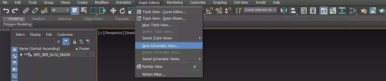 替换角色 以下步骤将在3DS MAX中进行。 打开导出的“NPC_BMI_SuYa_Skin00.FBX”文件。 从工具栏中选择【图形编辑器】>【新建图解视图】。