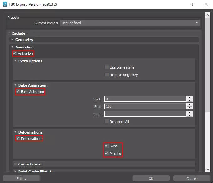 导出时,FBX导出窗口将会出现。勾选【包含】>【动画】中所有标红的复选框,然后点击右下角的【确定】进行导出。
