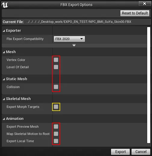 导出文件时,FBX导出选项窗口将会出现。请取消勾选所有红色选中的选项。(黄色复选框用于表情变形,勾选则会导出,否则忽略即可。)