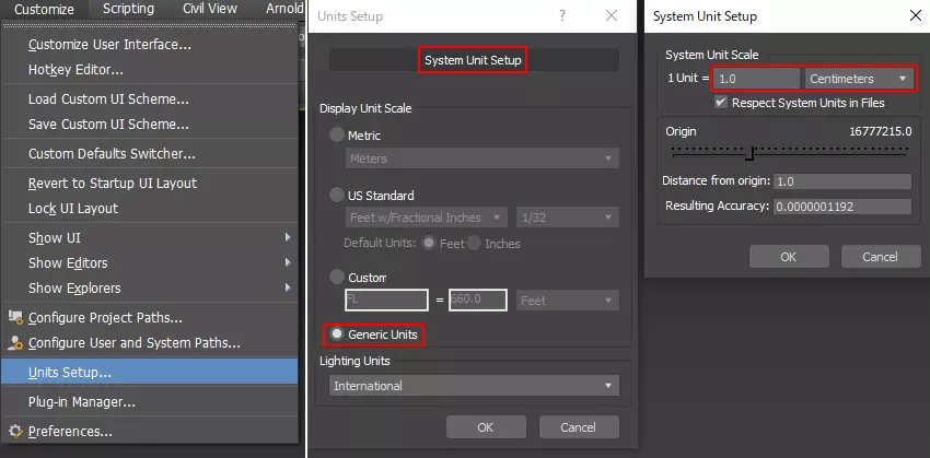 从工具栏中选择【自定义】>【单位设置】,然后选择【通用单位】。 选择【系统单位设置】,将1单位设为1.0,并将计量单位设为厘米。 (如果不这样做,角色比例会不正确。)