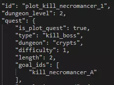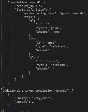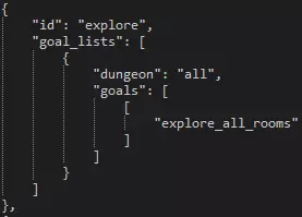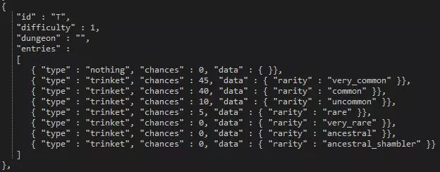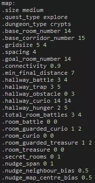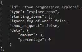 Variable Description is_progression This boolean determines whether or not the quest is needed to progress to the next plot quest in that area. is_repeatable This boolean determines whether or not you can repeat the quest after initially completing it. has_statue_contents This boolean determines whether or not there's a statue checkbox for completing the quest. completion_dungeon_xp This boolean determines whether or not additional XP is given to heroes based on a later table. You'll probably want to keep this set to false so you can manually tweak a single XP value for the quest yourself. is_town_progression_goals_enabled This boolean determines whether or not the requirements to progress a week are enabled. can_retreat This boolean determines whether or not the player is allowed to retreat from the quest. retreat_always_from_raid This boolean determines whether or not you can fail attempts to retreat from battle. If set to 'false', you can fail. retreat_party_kill_count This value determines how many party members are automatically killed if you retreat from the quest. is_surprise_enabled This boolean determines whether or not surprises are enabled during the quest. is_scouting_enabled This boolean determines whether or not scouting is enabled during the quest. is_roster_stress_cleared_on_completion This boolean determines whether or not all stress is removed from all heroes in the hamlet upon successful completion of the quest. upgrade_tags_to_remove_on_ignore If the quest is ignored, as it is with VVulf, this section can be expanded to describe what hamlet upgrades should be removed, if any. upgrade_tags_to_remove_on_failure If the quest is failed this section can be expanded to describe what hamlet upgrades should be removed, if any. roster_buffs_to_apply_on_failure If the quest is failed this section can be expanded to describe what buffs to apply to the entire hamlet roster, if any. roster_buff_on_failure_minimum_party_resolve_level If the above section is filled out with buffs, this value represents the minimum hero level that the buff should apply to. party_quirks_to_apply_on_completion Quirks to apply to the party upon successful completion of the quest. party_quirks_to_apply_on_failure Quirks to apply to the party upon failure of the quest. trinket_retention_minimum_rarity The minimum rarity for the quest to take from your trinket inventory. trinket_retention_count The number of trinkets the quest will take from your inventory. has_quest_select_warnings Whether or not the quest will warn you about not having trinkets equipped. has_provision_warnings Whether or not the quest will warn you about the amount of provisions you should be taking. suggested_trinkets This section can be filled in with suggested trinkets so that a prompt is given to the player before embarking. This is seen on the second Darkest Dungeon quest, more commonly referred to as DDQ2. additional_provisions This section can be filled out to determine what starting provisions or supplies the embarking team will be given. Quests - Generation & Restriction In the 'quest.generation.json' file is a larger section containing the week-to-week generation data. In order to effectively communicate such an expansive amount of data, the table below will describe the general nature and purpose of the data sets. Section Description number_of_quests_per_town_visit_table Each line of this section is a specific week, with more quests being generated as the in-game weeks pass. generated_dungeons For each of the area where quests can naturally generate (not plot quests), this section can define how many quests must be completed before each area opens up and can spawn quests. generated_resolve_level_difficulties In this small table you can set what level of quests should generate for what resolve levels you have in your roster. available_quests_table This much more massive table determines, for each area, what quests are available to spawn for what week. Each table in the separated square brackets denotes a week. Right away we can see that the first week in the Ruins there's only a single quest that can even be generated -- a short exterminate. heirloom_type_map This section determines what heirlooms can be rewarded from quest rewards. Note that this applies only to quest rewards, not loot. heirloom_amount_table The amount of heirlooms to be given for quest rewards. item_table The amount of gold to be given for quest rewards. resolve_xp_table The amount of XP to reward to heroes upon successful completion of a quest. trinket_chance_table The trinket table to determine the rarities of trinkets that can be rewarded as quest rewards. Level RestrictionYou can find the level restrictions in 'quest.restriction.json' file. Each row represents the maximum level of hero allowed to participate on a quest. Setting all to 6 or higher effectively removes the level restrictions. Random Dungeon Gen Random dungeon generation can only be controlled via a small number of variables. Below we'll use a medium Ruins explore as an example to describe how to manipulate each variable.