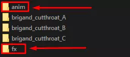 每行开头你会看到一个单词后跟冒号(:)。这些通常用于指定该行包含的数据类型,下面是一个表格,列出了每行的基本说明。与这里的大多数其他部分一样,建议你查看其他示例,因为某些独特的情况和机制仅存在于单个敌人文件中。 行 描述 display: 此行仅包含一个变量,即怪物所占据的空间数量。 enemy_type: 此行可以重复多次,用于确定敌人所属的类别。这些类别用于效果和增益中,这些效果和增益在其描述中需要特定的敌人类别。stats: 此行包含敌人的生命值、防御力、闪避率、速度以及各种抗性。 skill: 表示后续变量与敌人技能相关。大多数技能通常会有一组非常相似的信息,这些信息都应易于理解。 personality: 一个过时且多余的变量。保持为“-1”以避免问题。 loot: 此行可重复多次,用于确定敌人死亡时会调用哪些战利品表以及调用该表的次数。 initiative: 此行包含决定敌人每回合可行动次数的变量。monster_brain:这是敌人使用的AI逻辑ID。 death_class:此行决定敌人死亡后会变成什么怪物类型。如你所见,刺客会变成一具尸体。 battle_modifier:此行主要包含布尔值(本示例中均为布尔值,但其他敌人有其他修饰符)。刺客示例中的布尔值决定了诸如拖延惩罚和突袭机制等内容。 怪物 - 美术 我们将继续以“学徒级土匪刺客”为例,但这次我们将重点关注敌人的美术资源。在父文件夹“brigand_cutthroat”中,你应该会看到另外两个名为“anim”(动画)和“fx”(特效)的文件夹。