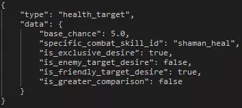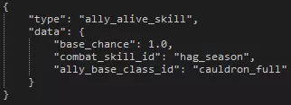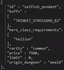 如上图所示,我们将以“自私”这一负面状态为例进行说明。“is_generated”属性自然是告知引擎该特性是否应在游戏中出现。若你将“overstress_type”修改为“virtue”,该特性就会被注册为正面特质。 “curio_tag”和“curio_tag_chance”属性使该特性能够与奇物产生互动,而如果像“自私”状态那样将“keep_loot”设为true,角色就会窃取战利品。 “buff_ids”是应用于处于负面状态或正面特质下英雄的一系列增益效果。只要特定的正面特质或负面状态处于激活状态,这些增益就会一直存在。 回合开始时的表现 在回合开始时,拥有该特性的英雄将有几率做出诸如大喊并造成压力、跳过回合等行为。你可以通过将概率设为0来消除这些情况的可能性,也可以通过增加数值来提高可能性。根据“自私”的数值,英雄在每回合开始时有33%的概率执行一次行为。你可以将该部分的所有概率相加,然后用特定行为的概率除以总和来得到这个数值。 反应行为 这些行为通常被称为“喊话”,是对某些事情的反应。这些喊话会伴随角色的台词,随后根据特质造成压力伤害或治疗。 这里的概率与回合开始时行为的概率不同,是转换为小数的百分比。例如,0.2的值在这里等于20%的概率。请注意,对于大多数动作场景,你需要为英雄编写对话字符串,以避免出现“空字符串”。 饰品 编辑或创建饰品非常简单,下面我们将以先祖的瓶子和自私吊坠为例,介绍饰品的大部分可能设置。