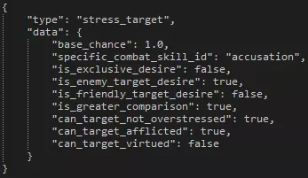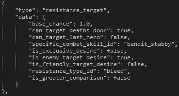 Example Effect Format Part Description effect: This is required for all effects to be parsed by the engine. .name This specifies the name of the effect so that when a hero, enemy, or curio calls it the engine knows which line of data it needs to read. .target This specifies the targeting parameters of the effect. For this example effect, the Jester's 'Inspiring Tune' targets any hero. This effect then is applied to that target. .curio_result_type Should an effect be used by a curio, this line followed by either "positive" or "negative" will determine which visual effect the player will see. .chance This is the chance for the effect to be applied. .healstress This, followed by a number, tells the effect to heal stress by a specific number. The number, ten in this example, is before any buff or debuff is taken into account. .on_hit & .on_miss These are boolean (true or false) values that determine whether the effect will apply if a skill hits or misses the intended target(s). .queue This optional parameter, also a boolean, can tell the effect to count after the others in the skill, if there's more than one of them. Effect Targeting Format Target Description performer This effect will target the hero/enemy it is assigned to. target This effect will target the hero/enemy in line with the skill's targeting parameters. performer_group This effect will target the entire hero/enemy party it is assigned to. target_group This effect will target the entire hero/enemy party in line with the skill's targeting parameters. performer_group_other This effect will target the entire hero/enemy party it is assigned to apart from the performer. target_group_other This effect will target the entire hero/enemy party in line with the skill's targeting parameters apart from the target. global This is reserved for light modifier effects. Important NotesIf no duration is assigned to an effect containing buffs, duration will default to 3 rounds If buffs are called from the buff library, but no duration is outlined in the effect, duration will first look for one in the buff library before defaulting to 3 rounds Take note of what the effect is trying to accomplish compared to the effect percentage. The chance percentage on a disease effect is NOT the chance for it to apply. The chance for a disease to apply is always 100%. The chance of the effect is the chance for there to be a disease check on the target. Buffs - Stat Types and Subtypes This section will go over all current buff/debuff types that can be applied to quirks, afflictions/virtues, skills, trinkets, supply effects, curio effects, etc... Buff Types and Subtypes Buff Stat Type Buff Stat Subtype Buff Description combat_stat_add crit_chance This adjusts the critical chance (CRIT) of the target. combat_stat_add defense_rating This adjusts the dodge (DODGE) of the target. combat_stat_add protection_rating This adjusts the protection (PROT) of the target. combat_stat_add speed_rating This adjusts the speed (SPD) of the target. combat_stat_multiply max_hp This adjusts the maximum health points (HP) of the target. combat_stat_multiply damage_low This adjusts the minimum damage (DMG) of the target. combat_stat_multiply damage_high This adjusts the maximum damage (DMG) of the target. hp_heal_amount This additively adjusts the minimum and maximum healing power of the target. A 1-1 heal with a "4.0" hp_heal_amount buff will become a 5-5 heal. hp_heal_percent This multiplicatively adjusts the minimum and maximum healing power of the target. A 4-8 heal with a "0.5" hp_heal_percent buff will become a 6-12 heal. hp_heal_received_percent This adjusts the healing received power of the target. stress_dmg_percent This adjusts the stress damage done by the target. stress_heal_percent This adjusts the stress healing done by the target. stress_dmg_received_percent This adjusts the stress damage received by the target. stress_heal_received_percent This adjusts the stress healing received by the target. resistance stun This adjusts the stun resistance of the target. resistance move This adjusts the move resistance of the target. resistance poison This adjusts the blight resistance of the target. resistance bleed This adjusts the bleed resistance of the target. resistance disease This adjusts the disease resistance of the target. resistance debuff This adjusts the debuff resistance of the target. resistance death_blow This adjusts the deathblow resistance of the target. resistance trap This adjusts the trap disarm chance of the target. poison_chance This adjusts the blight skill chance of the target. bleed_chance This adjusts the bleed skill chance of the target. stun_chance This adjusts the stun skill chance of the target. debuff_chance This adjusts the debuff skill chance of the target. move_chance This adjusts the move skill chance of the target. resolve_check_percent This adjusts the virtue chance of the target. A positive amount will increase the chance for a virtue, and a negative chance will increase the chance for an affliction. scouting_chance This adjusts the scouting chance of the party. remove_negative_quirk_chance This adjusts the chance for a negative quirk to be removed from a target. Currently all chances are guaranteed (Sanitarium and curios), so this buff remains unused. food_consumption_percent This adjusts the amount of food consumed by a party member. starving_damage_percent This adjusts the amount of damage done to a party member when starving. resolve_xp_bonus_percent This adjusts the amount of resolve experience the target gains at the end of a quest. upgrade_discount_weapon This adjusts the price of weapon upgrades for the target. upgrade_discount_armour This adjusts the price of armour upgrades for the target. party_surprise_chance This adjusts the chance for the hero party to be surprised. monsters_surprise_chance This adjusts the chance for the enemy party to be surprised. damage_received_percent This adjusts how much damage the target receives. This bu