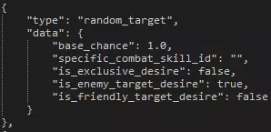 AI参考 - 目标选择倾向 本节涵盖了敌方AI的基本目标选择倾向。与上述技能选择倾向一样,这里仅介绍最基础的内容,建议你自行查阅文件以了解不同情况下的机制。 类型 描述 示例 random_target 怪物会随机选择目标。