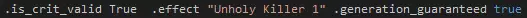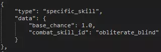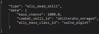 示例参数 .id:用于字符串、图像和音效引用的技能ID。 .level:该文本所描述的技能等级。0级为基础等级,对应游戏内的“1级”;4级为最高等级,对应游戏内的“5级”。 .type:特定增益参数所影响的技能类型。 .atk:技能的命中率。 .dmg:技能伤害与英雄基础伤害的比例。若设置为“-50%”,基础武器伤害为6-12的十字军的“重击”技能将造成3-6点伤害;若设置为“50%”,则造成9-18点伤害。 .crit:附加到武器暴击率上的技能暴击率。.launch 可使用该技能的阶级。 .target 技能所针对的阶级。若数字前有@符号,表示针对友方阶级;若有~符号,表示针对所有指定阶级;若有?符号,表示随机针对指定阶级中的一个。 .is_crit_valid 表示技能是否可暴击的布尔值。 .effect 与技能相关的效果列表。目前单个技能等级最多可绑定4个效果。世代保底:当英雄在驿站生成时,若此参数的布尔值设为“true”,则能确保该英雄生成时拥有指定技能。注意,每个英雄只能保底一个技能。 其他重要参数: - 参数:.heal 描述:此参数接受两个数值,第一个为最小治疗量,第二个为最大治疗量。可参考修女的治疗技能,其中有两个很好的示例。 - 参数:.move 描述:此参数需要两个数字。第一个数字表示向后移动的距离,第二个表示向前移动的距离。通用移动技能中能看到该参数最简洁的示例。self_target_valid:此参数后接布尔值,表示技能是否可以以施法英雄自身为目标。 .per_battle_limit:单个战斗中技能可使用的次数限制。 生成数据 最后一组行控制英雄的各种方面,例如生成方式、恢复增益、宗教标签等。所有这些参数都相当易于理解,建议查看其他英雄以了解细微差异。 怪物 - 数据 怪物通常可分为两部分来解释——数据和美术。数据包括属性、技能以及其他与怪物外观无主要关联的信息。在本示例中,我们将以“学徒强盗杀手”为例,其文件夹路径为“monsters brigand_cutthroat brigand_cutthroat_A”。使用记事本++等文本编辑器打开“brigand_cutthroat_A.info.darkest”文件。你可以将“语言”设置为Javascript以获得视觉辅助。此时你应该会看到以下内容: 若图片太小无法看清,请点击图片。