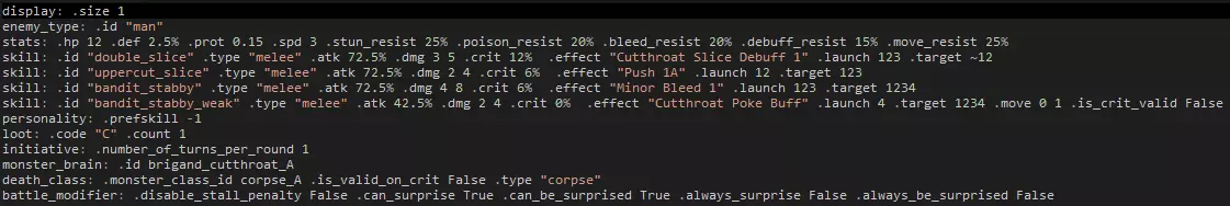 “anim”文件夹包含怪物的战斗动画以及其攻击的静态精灵图。“fx”文件夹包含所有技能特效,这些特效会在使用技能时出现在敌人、武器或目标身上。 动画和技能特效均使用“Spine2D”应用制作,但可以对实际的PNG图片进行简单编辑。请注意,若不使用Spine2D,则无法修改骨骼的整体运动和边界。 在各个敌人子层级文件夹(本示例中为“brigand_cutthroat_A”)中,你会找到“brigand_cutthroat_A.art.darkest”文件。此文件可在任何文本编辑器(如Notepad++)中打开,其中包含将精灵动画和视觉特效与特定技能绑定所需的信息。怪物遭遇群(“Mashes”) 定义等级 Mashes(更常被称为遭遇战)相当容易理解。首先,让我们在“理论上”和游戏内定义敌人等级!