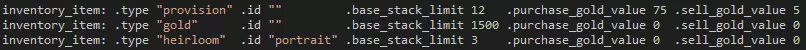 变量 描述 id 附加到战利品表的ID。 difficulty 该表适用的难度。若设为“0”,则该表可被所有难度调用。 dungeon 该表适用的地牢。若留空,则该表为通用表。 entries 与该表关联的条目列表。 可引用的物品列表: 补给品 金币 传家宝 宝石 物资 日记页 范围和特定页 饰品 其他战利品表 库存 购买/出售成本及堆叠上限 在“inventory”文件夹中,你会找到决定堆叠上限以及任务结束时购买物品和出售物品成本的文件。