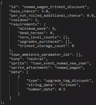 There are 13 lines in the image above, and in the table below you'll find a general explanation for the first 12 lines (line 13 is redundant for this explanation) and what they mean. As mentioned above, use other curios as examples for what you want to tweak or add, and use this reference as a supplement if you're confused. Line Description & Notes 1 In the first line we have three values which serve mainly as references and information for the curio itself. The number 2 in this line represents that it's the second curio in this file. Immediately after that we have the Curio's name. Note that this is not the name that appears in-game, rather one that helps you know what it is. The last bit here notes that there are 'mixed' effects possible. You can get loot or get a nasty DoT. Other curios may be completely good or bad in their possible effects. 2 There's nothing that you want to change in this line, and none of it is read by the engine. If you imported the csv to a spreadsheet program you'll see that these are all column headers mainly used in easily reading the following lines. 3 The first value in this line is incredibly important. This ID, following the format of having no spaces, will be used when you want to reference art and strings that will appear in-game. Following that is the effect of 'Nothing', or interacting with the curio and having nothing happen. After 'Nothing' you'll want to put the weight of the 'effect' to happen. This weight is divided by the curio's total weight of effects. 4 We'll start this line at the 'Loot' part, as the 'REGION FOUND' text is not important to the overall functionality of the curio. Here you can set the chance of loot, if any, and the tables it should call. The '1' in the column after 'Loot' is the weight of that 'effect' to happen. There are only two possible effects for the Locked Strongbox, loot or a DoT. As you can see in the 6th line, 'Effect' has a weight of 1 as well. Add up the weights and then divide the current 'effect' weight by the total. Each has a 50% chance of happening, as you can see. The 50% chance following the weight is a value that is calculated in the original spreadsheet and is not read by the engine at all. The engine will only take weights into account. After the 50% is the table that it pulls from, and the number in the next column is the number of pulls that it does from the specified loot table. You can repeat loot table calls an additional two times by putting the desired table and number of draws before the '<- # Draws' sections. When loot is awarded it will award all loot tables listed for the specified number of draws for each table. 5 This line lets you set a quirk reward as a curio interaction. This follows a similar format of 'weight,% chance,result' as other effects. An excellent example of the quirk effect can be seen on curio #7, the Stack of Books. 6 This line lets you set effects that are given when interacting with the curio. A maximum of three possible effects can be added to a curio's effect rewards. The weights in lines are different from the overall weight of individual interaction types like loot, quirk, and effect. 7 The immediate first value is quite important. The 'Yes' or 'No' will determine if the curio prompts the player for any item inputs or whether the curio can just be used like a sack or crate. If your curio has no item interactions, set this to 'No'. The 'Purge' effect allows you to remove a quirk, positive or negative. Curio #5, the Eldritch Altar, shows an excellent example of this. 8 This line allows you to set scouting events that can trigger as an effect. Curio #20, the Bookshelf, has a great example of this effect. Much like the other effects you must set weights for the different scouting examples to proc, but the data that you put into the proper column is a bit different. As you can see in the Bookshelf, there is a '0 - curios' and a '0 - all' listed. The number in each is the number of rooms this scout will go, so both will only extend to the hallways on each side. The string on the opposite side of the dash describe what the scout will reveal. This can be 'curios', 'all', 'room_battles' and more. As recommended at the top of this section, take a look at all curios for further examples. 9 The first two string values in this line are the curio 'tags', or two describing tags of what the curio is. These are used mainly by quirks that interact with specific curio tags, like Hyromania or Bloodthirsty. The 'teleport' effect after the tags is unused and dysfunctional, so it is not relevant to the curio's overall functionality. 10 After two of the commas in this line you can set a third tag, though it's not set on all curios. You can see this in the next curio in the file, the Goal Strongbox. It has the tags of 'Treasure', 'Goal', and 'All'. The last tag is used mainly by the quirk of Curious, which can interact with any curio tagged with 'All', which is all of them. This line also lets you set a disease effect. An example of this can be seen in the 8th curio, the Iron Maiden. You can either call specific diseases and/or any of them. 11 Nothing in this line needs to be edited; it acts mainly as a separator and reference line for the following item interactions. 12 This is the first item interaction. A Skeleton Key can be used on the Locked Strongbox to get 3 pulls from the loot table 'A'. You can use any of the main 'effects' as item effects, but note that you can only have a single possible effect tied to a single item. It is not possible, for instance, to have a Skeleton Key give loot or a quirk on the same curio. Take a look at all of the curios for many, many examples of item interactions and their precise formatting. Town Activities and Shops Town building information can be found primarily in two spots. The first area contains all of the building information aside from the upgrade costs. The second contains only the upgrade costs. General InformationYou can get to the location of 