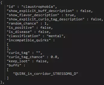 左侧你可以看到“黑死病”这一疾病,右侧则是“幽闭恐惧症”怪癖。 变量 描述 id 此ID将用于识别怪癖的字符串以及与其他怪癖之间的不兼容性。 show_explicit_buff_description 若此变量设为false,则不会显示怪癖所分配的增益效果。 show_flavor_description 若此变量设为true,则会显示自定义字符串描述,而非所分配的实际增益效果。 show_explicit_curio_tag_description 若此变量设为true,则会显示怪癖与奇物的互动几率。random_chance:此变量表示该特质相对于其他特质出现概率的大小。 is_positive:此布尔值用于判断该特质是正面还是负面。 is_disease:另一个布尔值,用于判断该特质是否为疾病。 classification:可以是“physical”(身体)或“mental”(精神)。身体特质更可能在任务结束时赋予那些以较低生命值离开的英雄。精神特质则更可能赋予那些 incompatible_quirks:在此处可以列出若英雄拥有当前指定的特质,则不会被赋予的其他特质。curio_tag:此处可指定怪癖将强制英雄互动的奇物标签。这要求下一个数值大于0。 curio_tag_chance:英雄与上述指定标签的奇物进行互动的概率。 keep_loot:若设为“true”,当英雄强制与奇物互动且结果为战利品时,将窃取该战利品。 buffs:与怪癖相关的增益效果列表。 特性 - 负面状态与美德 负面状态和美德(统称为特性)可轻松修改,且添加新特性也无需过多工作。在本节中,我们将简单介绍特性的不同组成部分,以便你能轻松修改或添加自己的特性!ID、遗物与增益效果