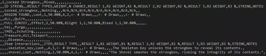 变量 描述 .size 表示地牢的大小,分为短、中、长。 .quest_type 表示任务类型,从任务文件中提取。 .dungeon_type 任务发生的区域。 .base_room_number 引擎应生成的基础房间数量。 .base_corridor_number 引擎应生成的基础走廊数量。 .gridsize 房间生成所在的网格大小。 .spacing 房间之间的走廊地砖数量。 .goal_room_number .connectivity 地牢的整体“连通”感。数值越高,房间之间通过走廊连接的可能性越大;数值越低则相反。 .min_final_distance:到达目标房间的最小最终距离,通常用于 Boss 任务。 .hallway_battle:地牢中走廊战斗的最小和最大数量。 .hallway_trap:地牢中走廊陷阱的最小和最大数量。 .hallway_obstacle:地牢中走廊障碍物的最小和最大数量。 .hallway_curio:地牢中走廊奇物的最小和最大数量。hallway_hunger:地牢中饥饿地砖的最小和最大数量。请注意,回溯时有几率生成额外的饥饿地砖,这些地砖不计入此数值。 .total_room_battles:生成的房间战斗的最小和最大数量,包括以下所有相关变量。 .room_battle:仅生成房间战斗(仅敌人)的最小和最大数量。 .room_guarded_curio:生成有守卫的房间奇物的最小和最大数量。 .room_curio:生成无守卫的房间奇物(无敌人)的最小和最大数量。.room_guarded_treasure 生成有守卫的房间宝藏奇物的最小和最大数量。 .room_treasure 生成无敌人的房间宝藏奇物的最小和最大数量。 .secret_rooms 生成秘密房间的最小和最大数量。 .nudge_span .nudge_neighbour_bias .nudge_map_centre_bias 手工设计地下城 自定义地下城最好在谷歌表格或微软Excel中制作。首先,你需要获取制作地图所需的电子表格。关于如何制作地图的说明已作为单元格注释包含在内。 谷歌表格 - 从菜单中制作副本 微软Excel的XLSX文件 -重要说明 地图只能通过剧情任务调用,因此请确保正确设置剧情任务。 运行mod导出器XML时,CSV文件将自动处理为DM文件。 如果地图数据中存在错误或缺失,自定义地图可能会非常不稳定。创建地图时请务必格外小心! 珍品 珍品数据文件“curio_type_library.csv”是从电子表格导出的逗号分隔值文件。有些人可能会发现将该文件重新导入到Microsoft Excel或Google Sheets等软件中会很有帮助。这样做实际上可以将其重新导出为游戏可用的CSV文件,不过这是一个可选步骤,但由于初次查看此特定文件可能会比较困难,因此建议进行此操作。在本示例中,我们将查看“Locked Strongbox”(上锁的保险箱)古董,它是此文件中的第二个古董。强烈建议你查看所有古董的设置,以更好地理解各个机制及其设置方式。即使遗漏一个逗号,都可能导致引擎无法读取该文件,因此务必谨慎。此外,所有完全大写的内容均为原始电子表格中的标题,并非对引擎有影响的值。最后,此文件中所有字符串集(文本句子)均不会被引擎读取。修改、添加或删除这些句子不会对游戏内显示内容产生任何影响。 你可能需要点击此图片才能更清晰地查看。