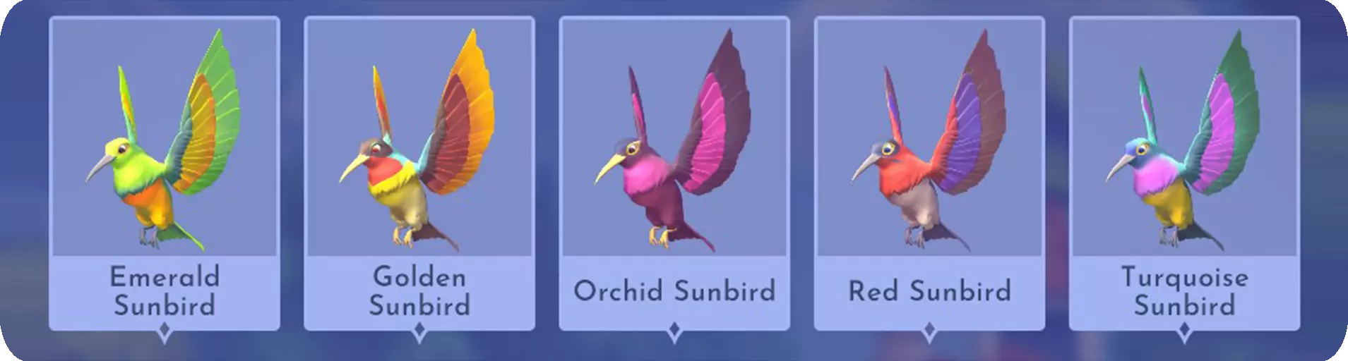 出现位置:阳光高原 鸟类及其喜爱的食物: - 翡翠太阳鸟 - 绿色西番莲 出现时间:周日[中午12点-午夜12点],周二/周三/周六[全天] - 金色太阳鸟 - 向日葵 出现时间:周日[午夜12点-中午12点],周二/周四/周五[全天] - 兰花太阳鸟 - 橙色长生草 出现时间:周五[上午9点-下午3点] - 红色太阳鸟 - 红色凤梨 出现时间:周日[中午12点-午夜12点],周一/周四/周六[全天] - 青绿色太阳鸟 - 粉色长生草 出现时间:周日[午夜12点-中午12点],周一/周三/周五[全天] 接近方法: 走向它们即可直接喂食